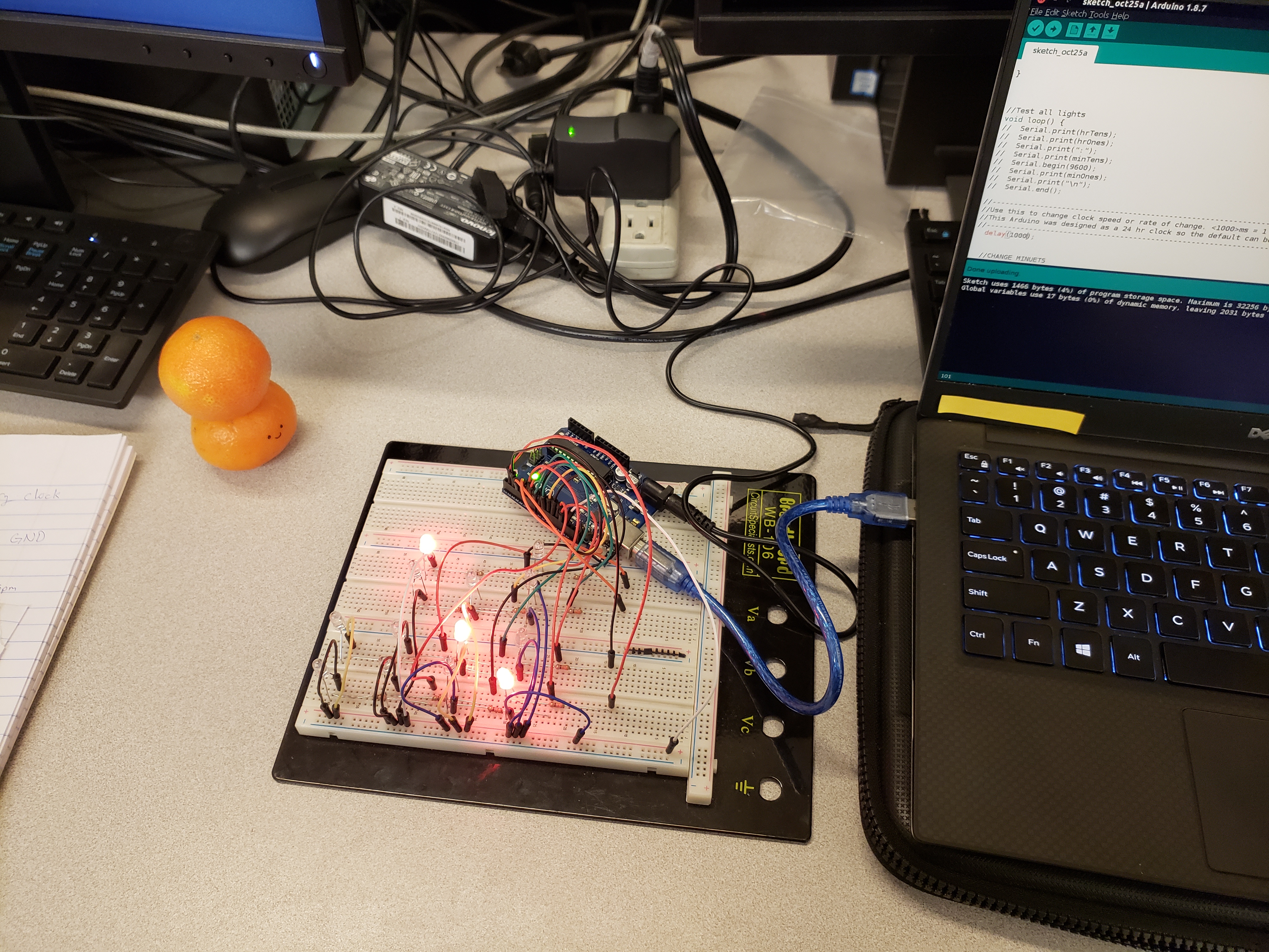 One of our limitations is that we only had 13 pins on this arduino and so we couldn't implement a seconds column although if we had the parts we probably could have.