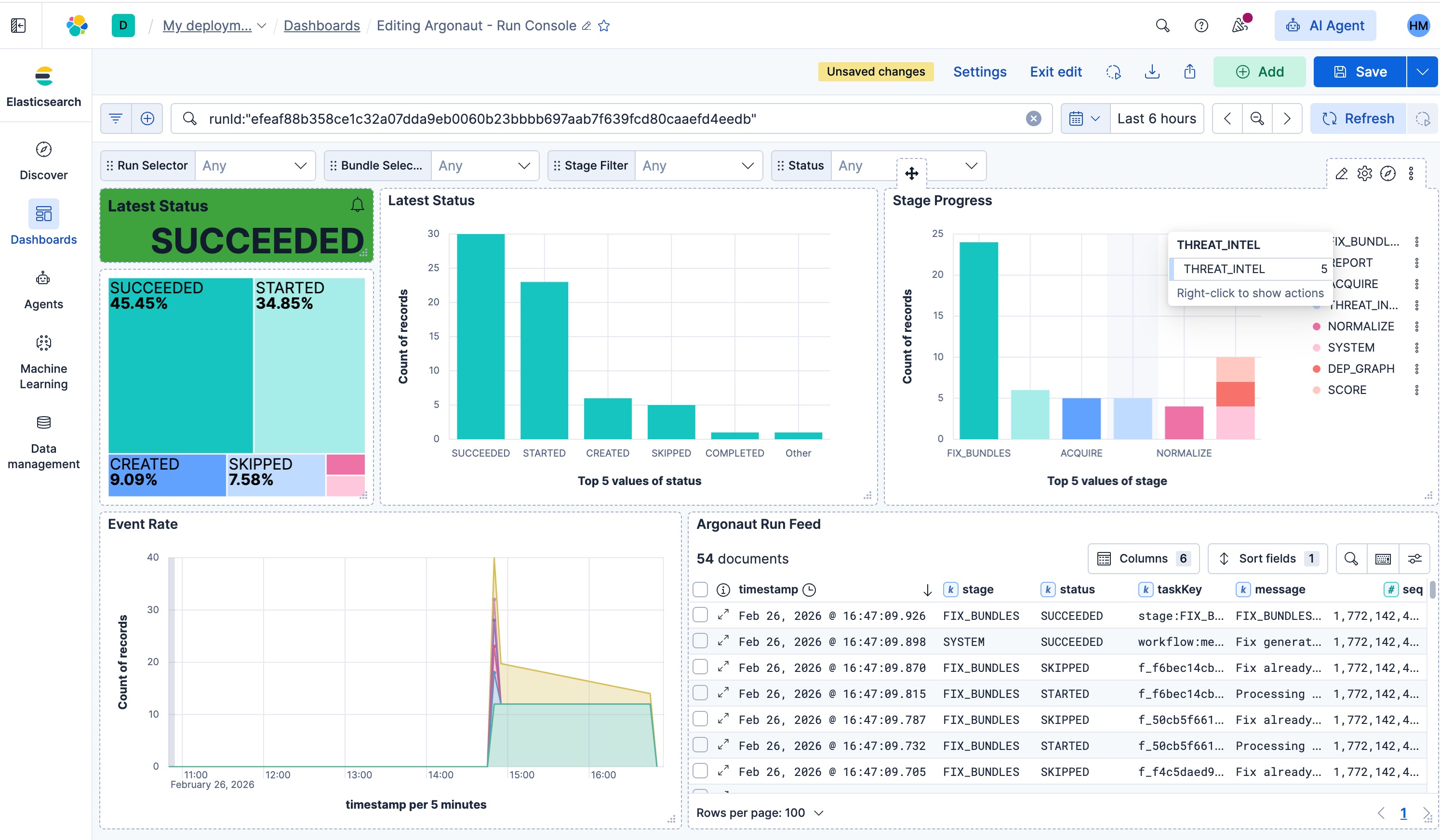 - Making the agent story credible: the solution was treating run headers + task logs as first-class ES documents and building everything around that.