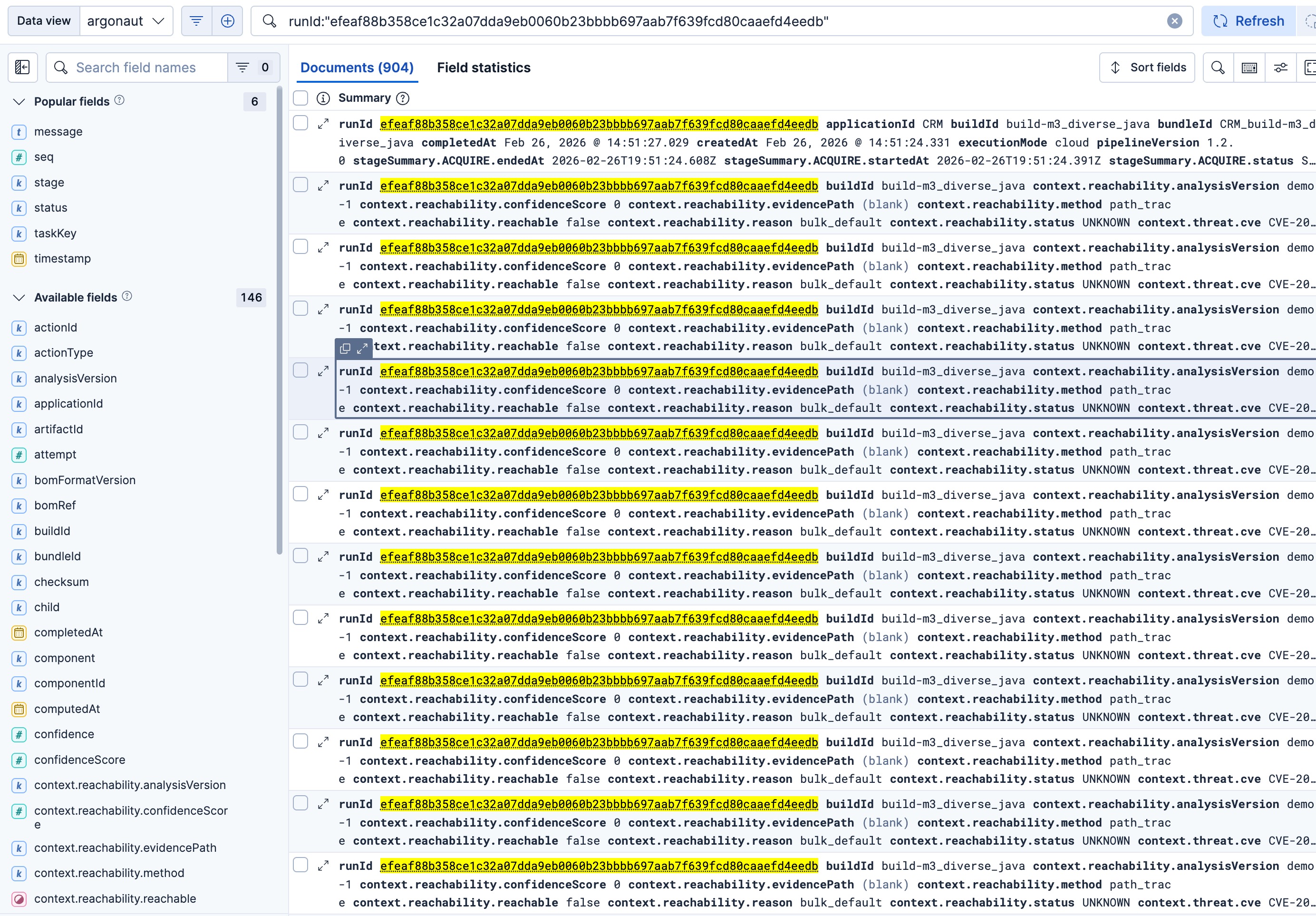 Pipeline (current): 1) Acquire: ingest bundle inputs deterministically ©rrently via object store drop. API Push or MCP to common security tools in future to acquire autonomously), validate structure + hashes 2) Normalize: convert artifacts into canonical document shapes (stable IDs, stable ordering) 3) Write: persist run state + normalized docs into Elasticsearch in a fixed, predictable order 4) Triage: compute reachability/fixability slices (the “800 → 50 → 7” moment) 5) Notify: post to Slack when scan received and when fix bundle is ready 6) Fix Bundle (safe handoff): Use AI to generate a developer-ready fix artifact and hand it off securely