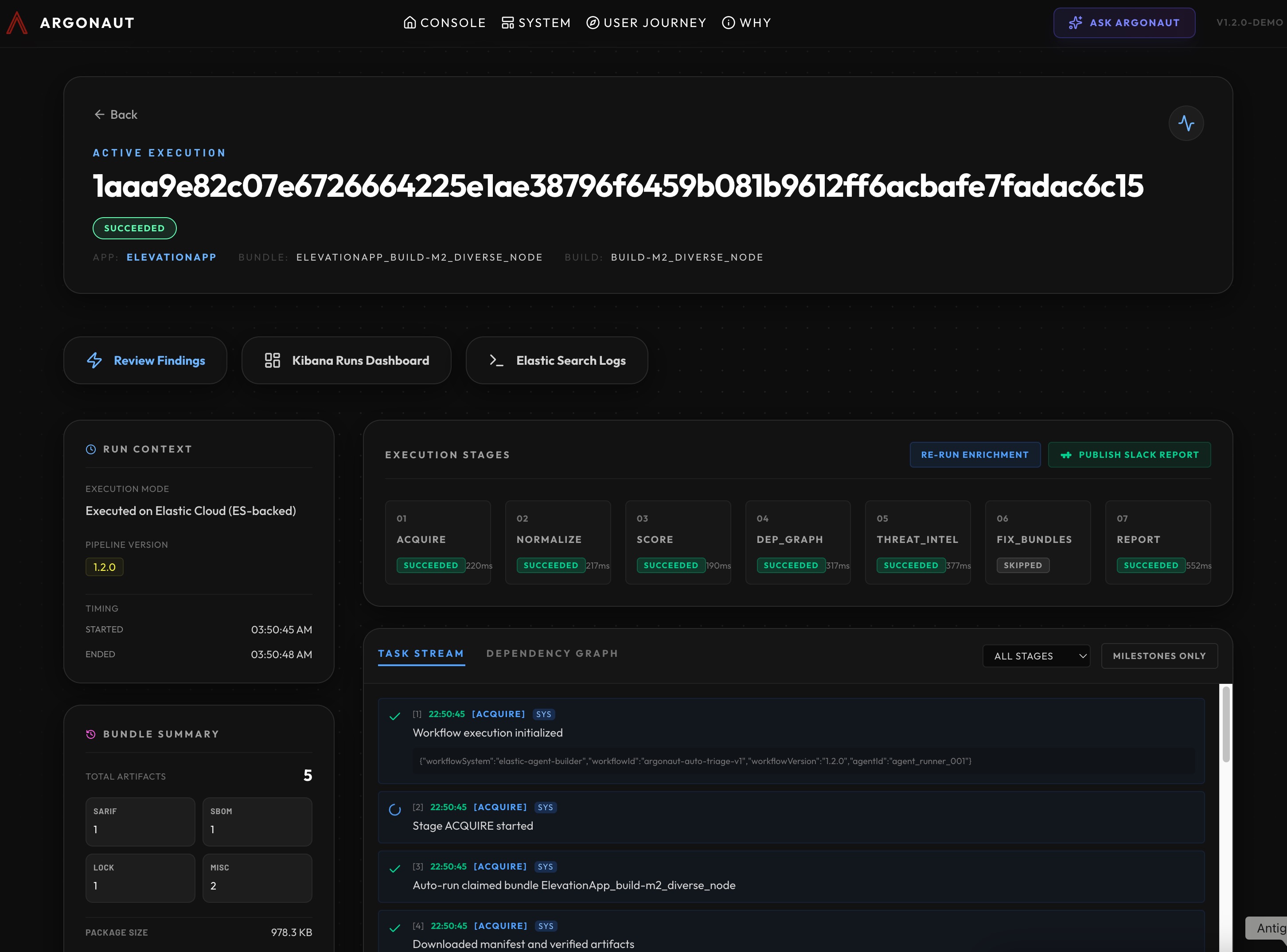 The key idea ids that “agent did this” isn’t a claim but an actual evidence trail. Runs, stages, and task traces are searchable in ES and explorable in Kibana.