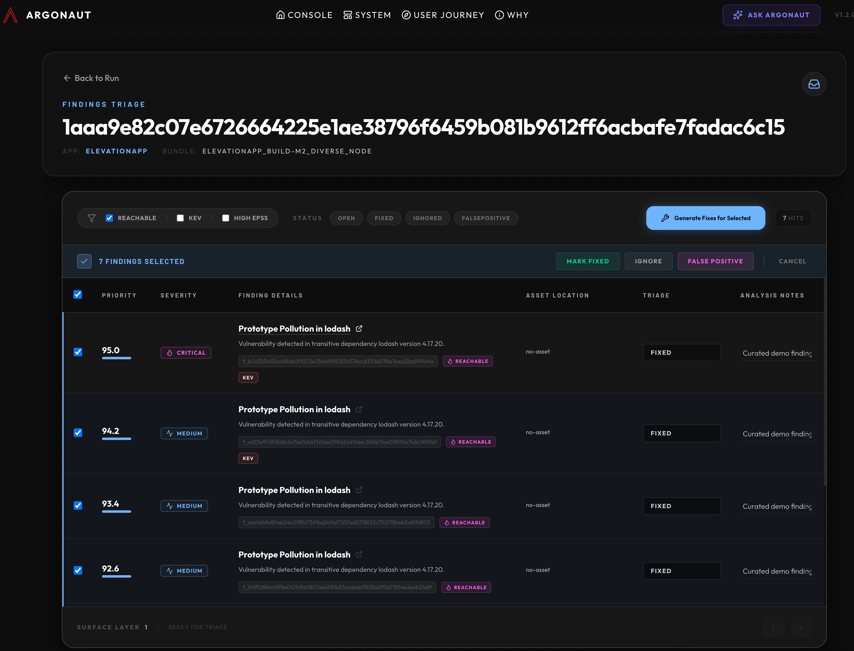- End-to-end flow that feels real: scan in → triage → 7 reachable → fix bundle → Slack handoff
