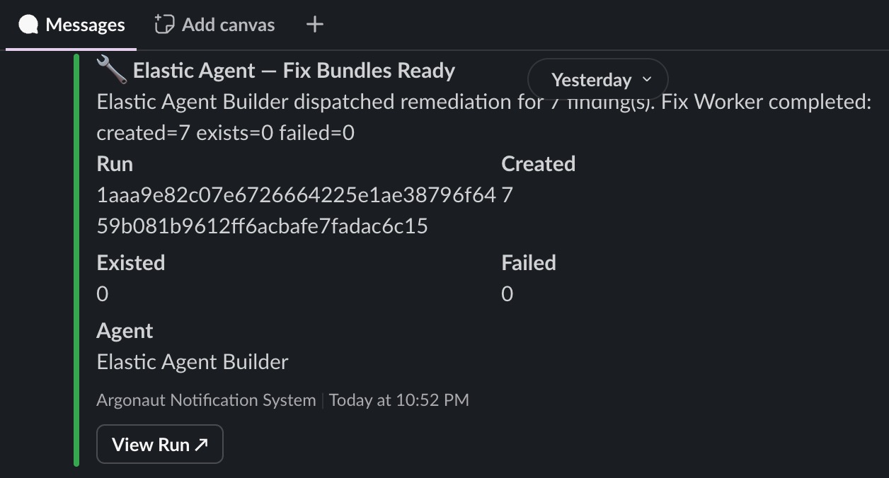 - Slack posts Fix bundle ready to the developer, with a link + run reference