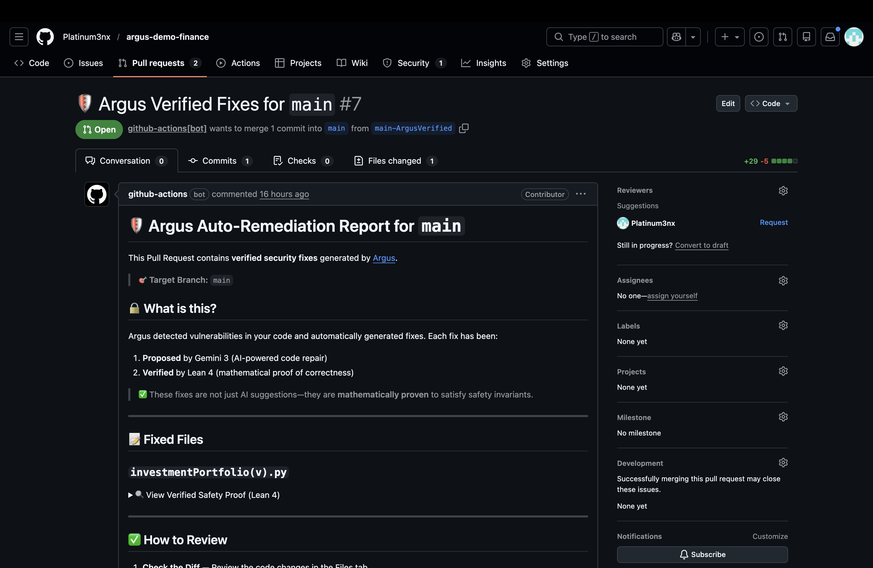 4. Auto-Remediation: Argus automatically opens a Pull Request with the provably correct fix, complete with a readable report and deep secrets detection for leaked credentials.