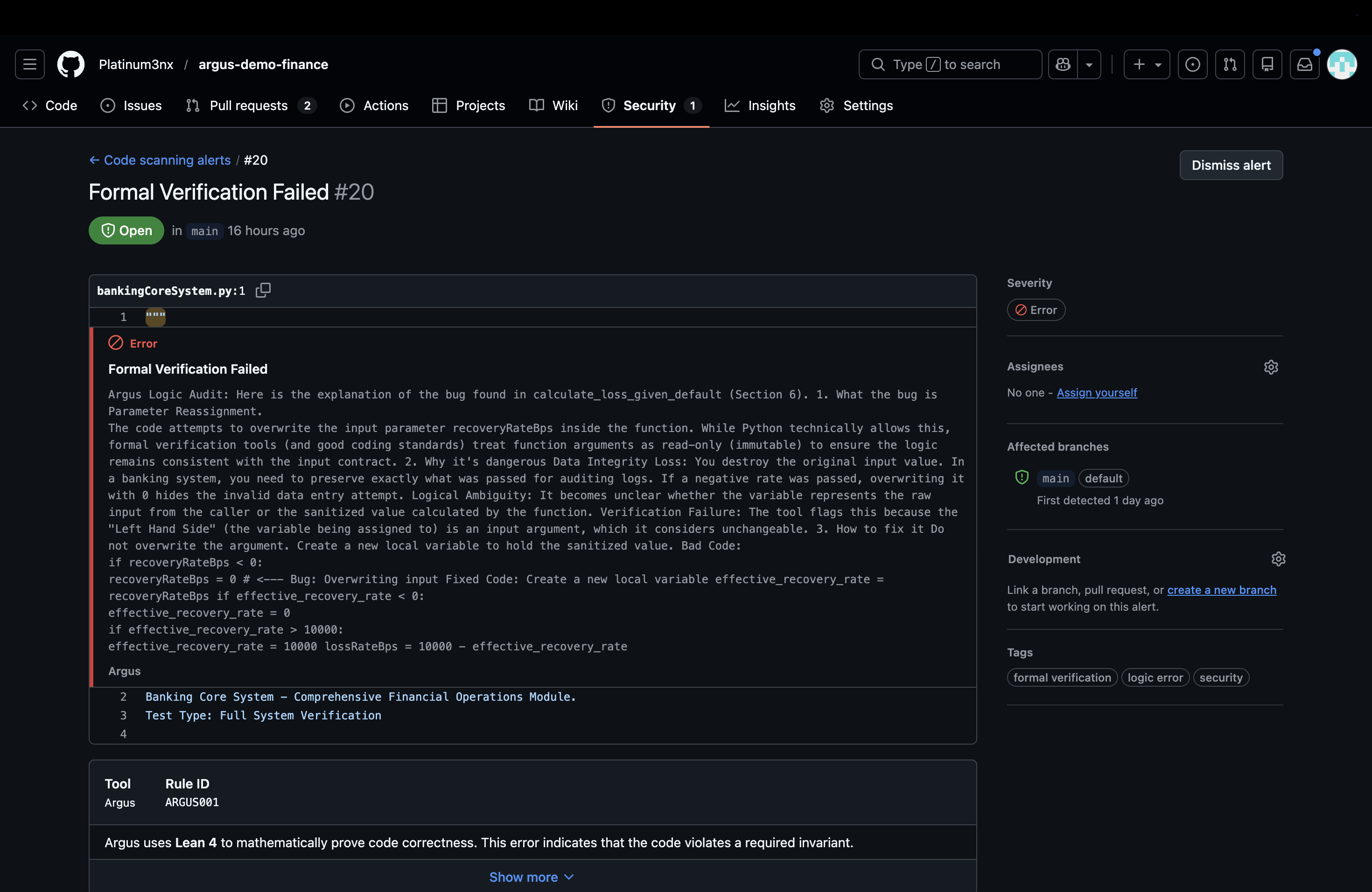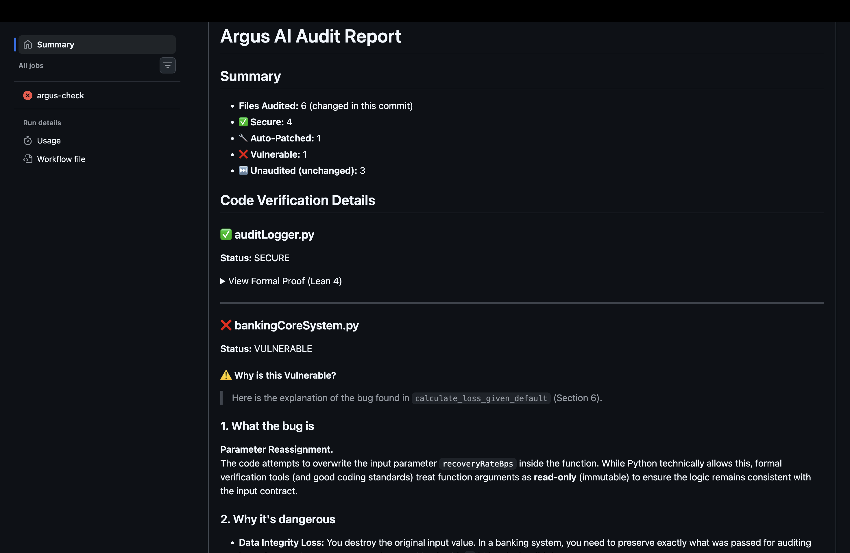 2. Expanding the utility: Argus is currently optimized for Python logic. To be a comprehensive enterprise solution, I plan to expand our transpiler to support TypeScript/JavaScript (for frontend validation logic) and Solidity (for smart contracts). The underlying neuro-symbolic architecture—routing logic to Lean/Dafny via ASTs—is language-agnostic and can be adapted to these new domains.