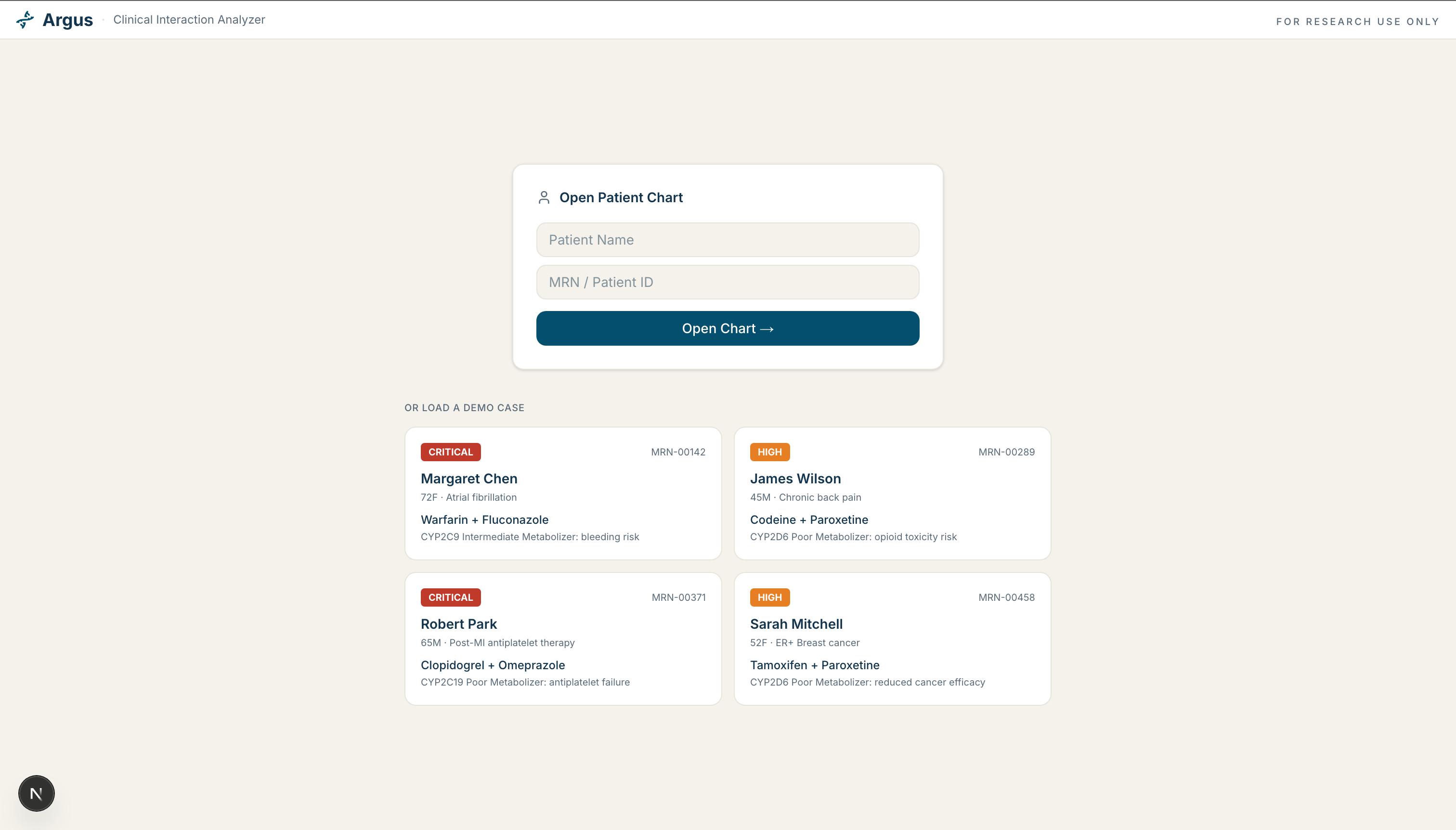 Argus is built on a core architectural insight: logic first, AI reasoning second. The foundation is a CYP Collision Detector. We built a curated database mapping commonly prescribed drugs to their CYP enzyme interactions, sourced from the FDA CYP450 drug interaction table, and validated against PharmGKB. When a clinician enters a patient's medication list, this layer maps every drug to its enzymes, finds overlaps, and produces a precise collision map. It cannot hallucinate. The same input always produces the same output.