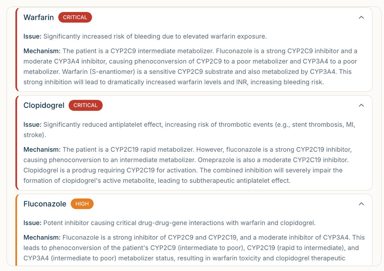 Real patients, especially elderly ones, are often on 8–12 medications concurrently. Many of those drugs compete for the same metabolic enzymes —for example, CYP2D6, CYP2C19 or CYP2C9. When a drug inhibits an enzyme that another drug depends on, and the patient's genome already makes that enzyme slow, the effects cascade in ways no single-drug lookup table can capture. That is not a lookup problem. That is a reasoning problem. We built the tool that reasons.