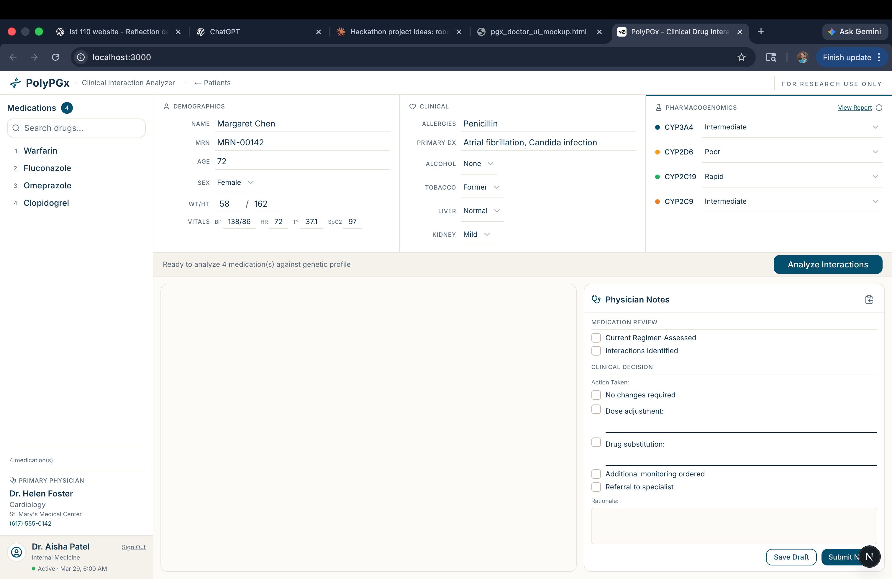 What inspired us to begin this project is a gap hiding in plain sight. Pharmacogenomics (PGx) — the science of how your genes affect how you process drugs — has produced genuinely powerful tools. But almost every clinical PGx tool analyzes only one drug at a time. A patient gets a flag: CYP2D6 poor metabolizer → avoid codeine. Simple. Useful. But incomplete.