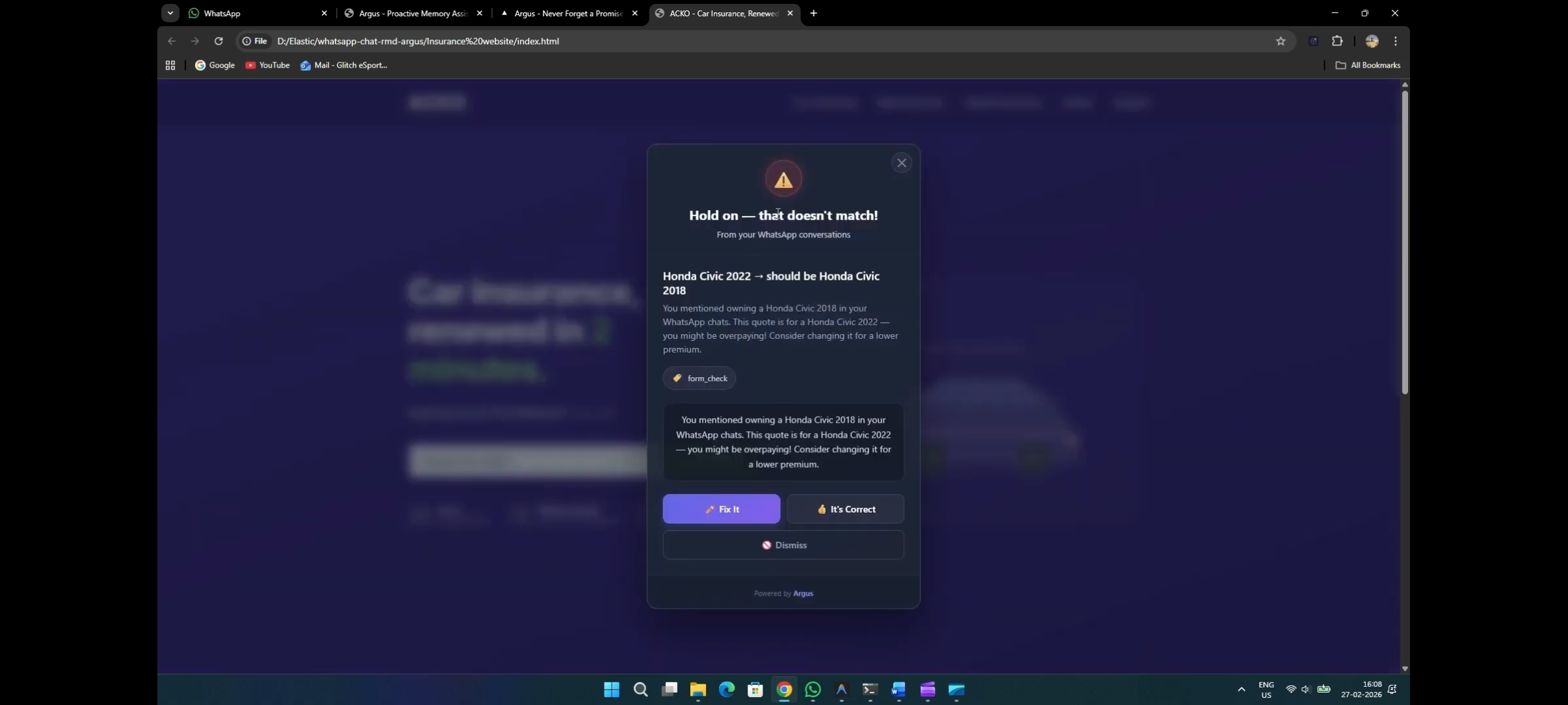 DOM Form Watcher (Insurance Scenario): MutationObserver detects dynamically added form inputs Regex parser extracts car make/model/year from input field values Calls /api/form-check to cross-reference against WhatsApp chat history Triggers "form mismatch" popup if discrepancy detected