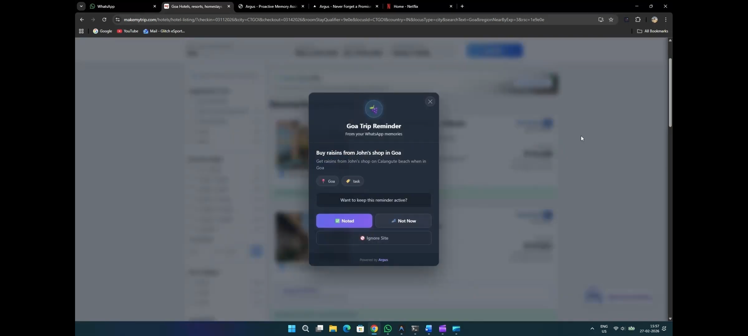 Proactive Recall (Powered by Gemini 3) The Brain: Argus sends your current browsing context to Gemini 3. The Match: Gemini queries your past WhatsApp history to find relevant links, dates, or recommendations. The Result: If it finds a match, it doesn't wait for you to search it injects a smart notification directly into your current webpage.