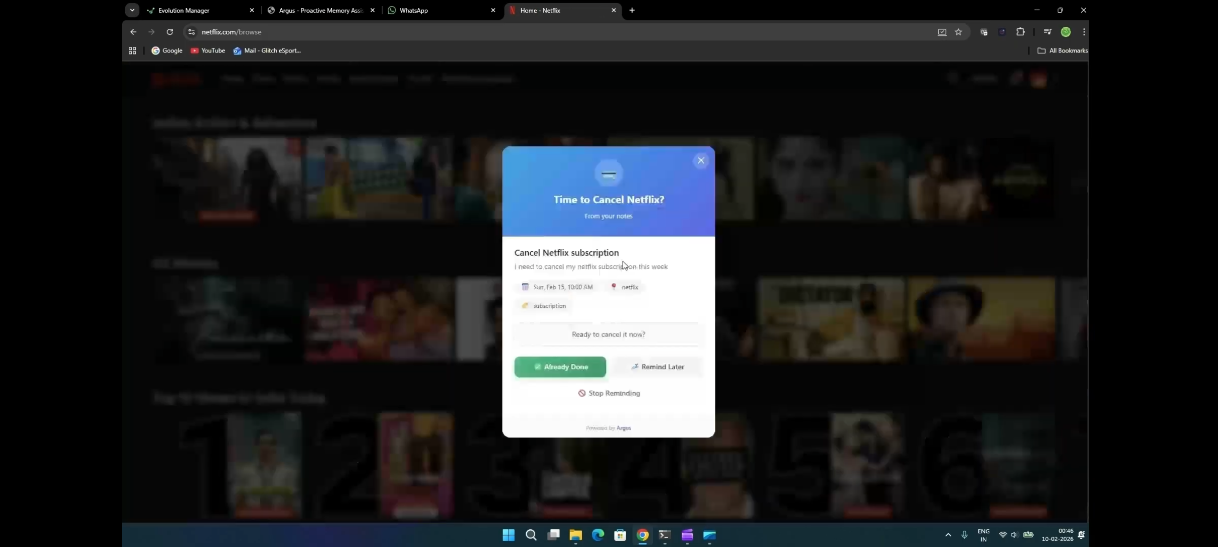 We built a multi-layered event-driven architecture that bridges real-time WhatsApp messaging with live browser context to deliver proactive, context-aware reminders. Argus is a proactive intelligence layer that sits between your private communications and your active web browsing. It eliminates the "Context Gap."