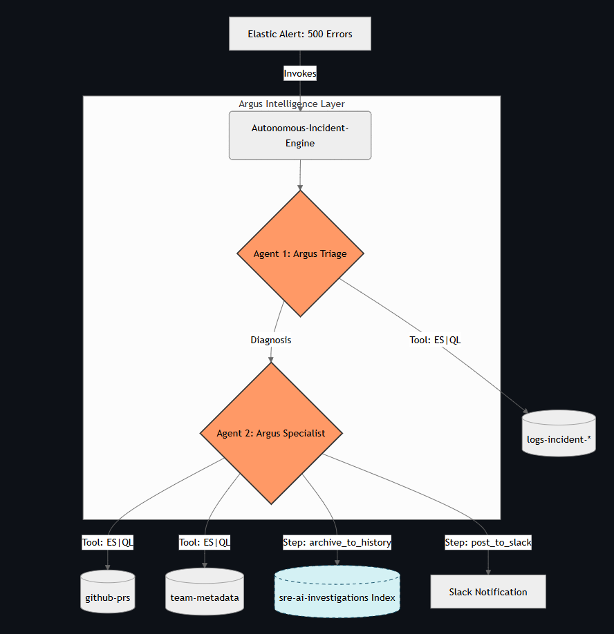 - Elastic Agent Builder & Workflows: This is the "brain" of Argus-SRE. We used the Agent Builder to define specialized Triage and Specialist agents, orchestrating a "Chain of Thought" workflow.