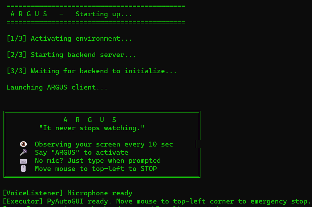 SpeechRecognitionlistens for the wake word "ARGUS"PyAutoGUIexecutes real mouse movements and keyboard actions