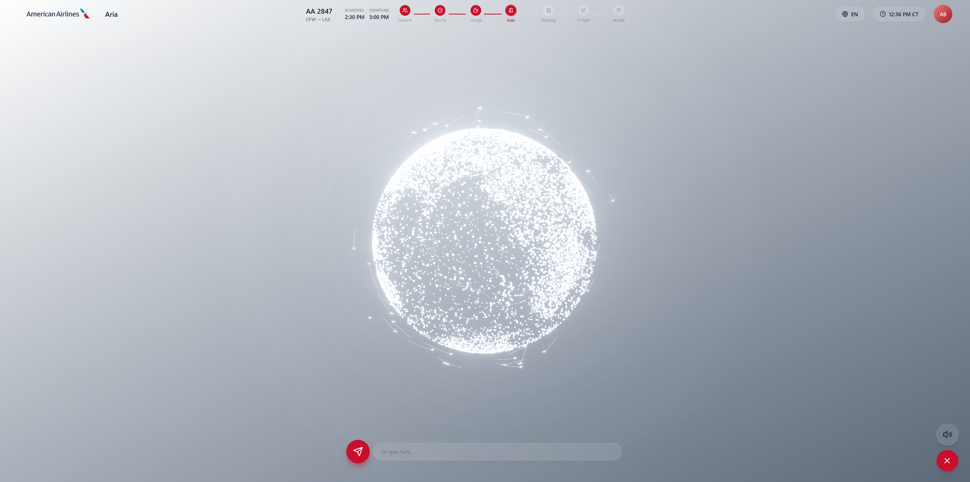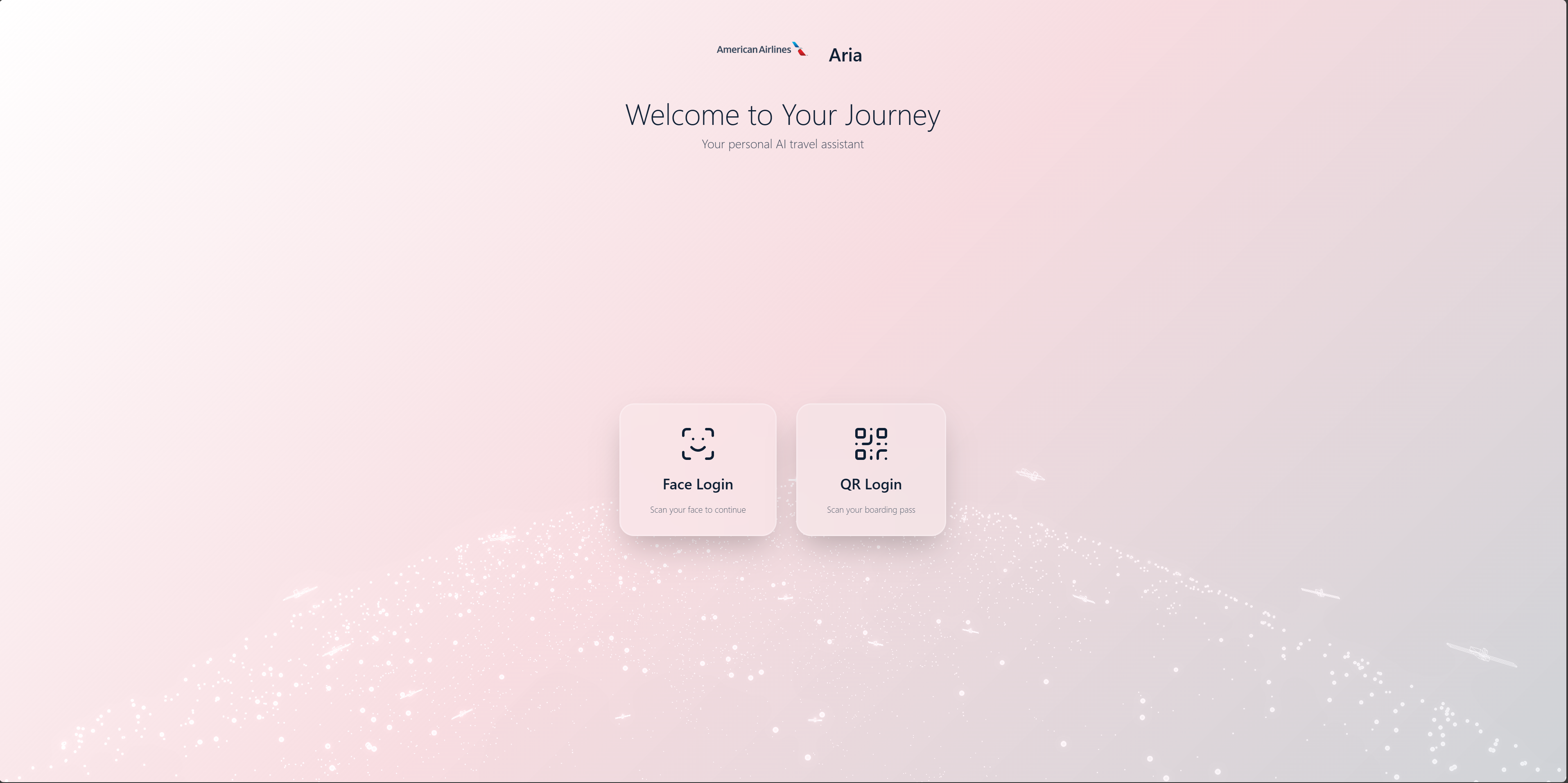 Aria is a multimodal AI kiosk designed for airports. Passengers authenticate via face recognition or QR code, then interact with a 3D animated assistant through voice or text.