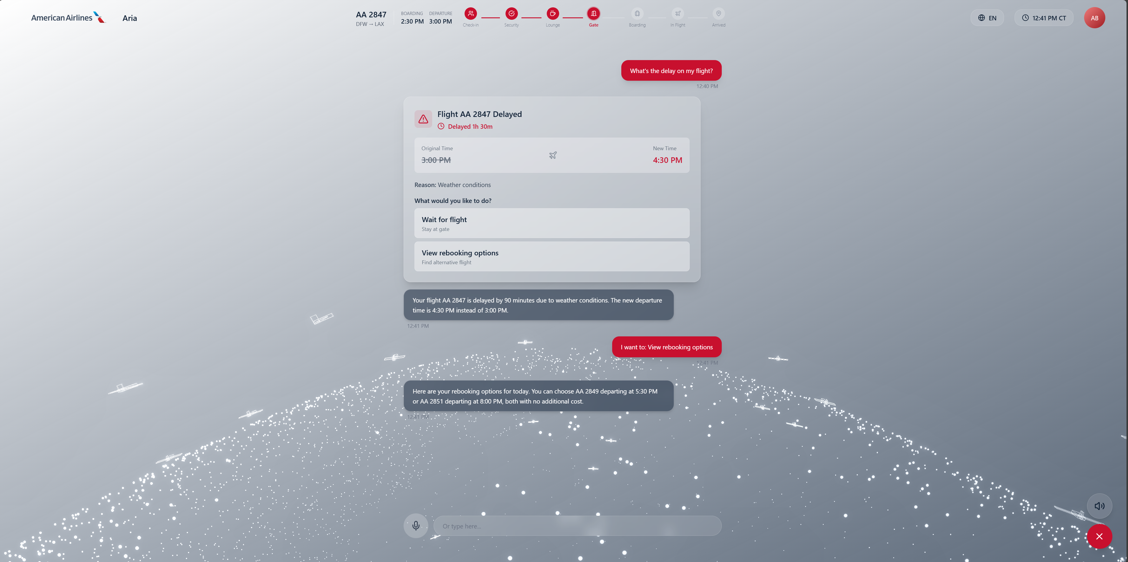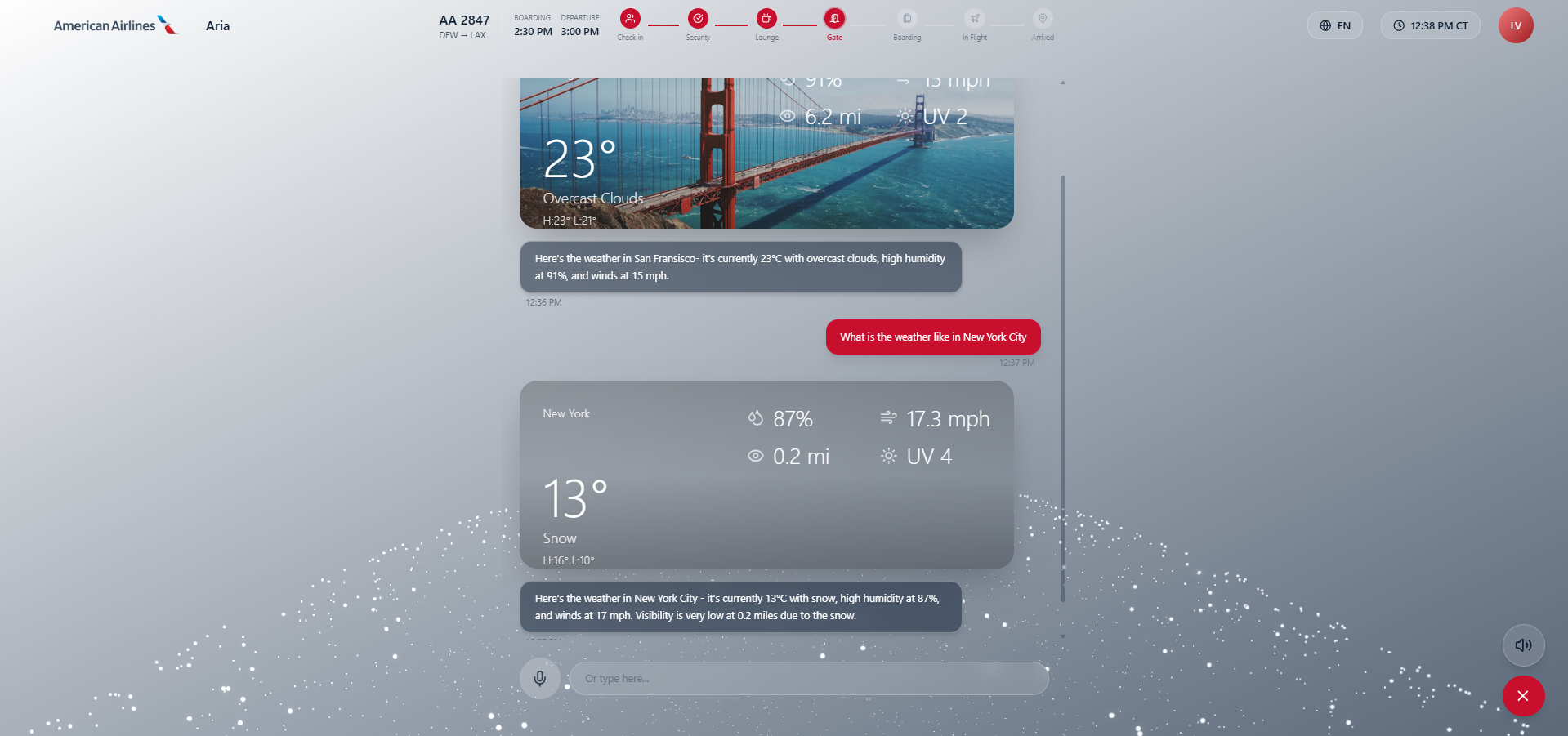 (gates, boarding times, delays, cancellations) - Show weather for origin and destination cities
