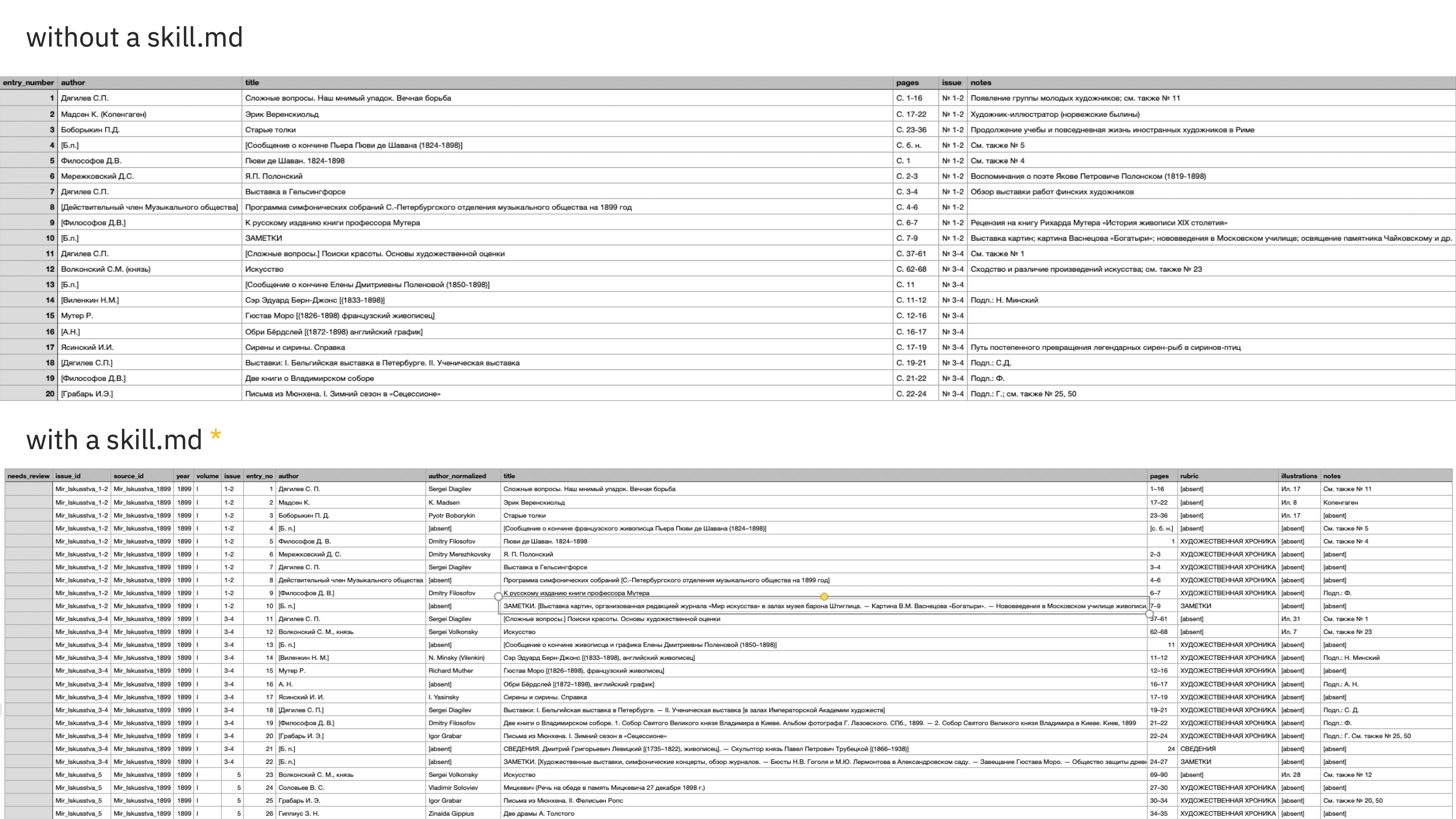 The most important thing we learned is that the bottleneck in humanities data work isn't AI capability — it's the interface between researcher knowledge and AI behavior. A well-authored instruction file closes that gap more reliably than any amount of prompt engineering in the moment. The skill format works because it makes implicit expertise explicit and persistent.