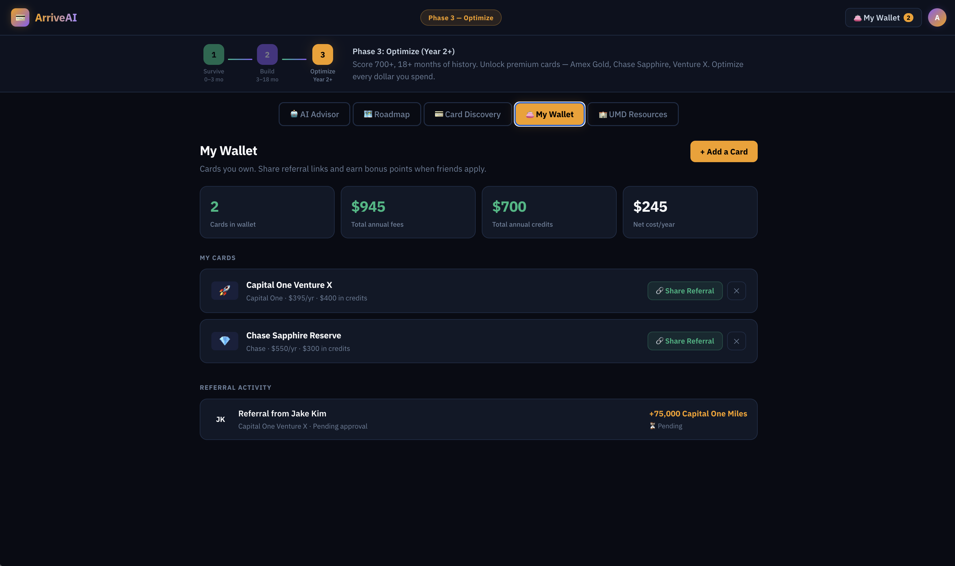 Today I have $2M+ in credit limits and 500,000+ points — built entirely from scratch starting with a single student card. That journey is what ArriveAI is.