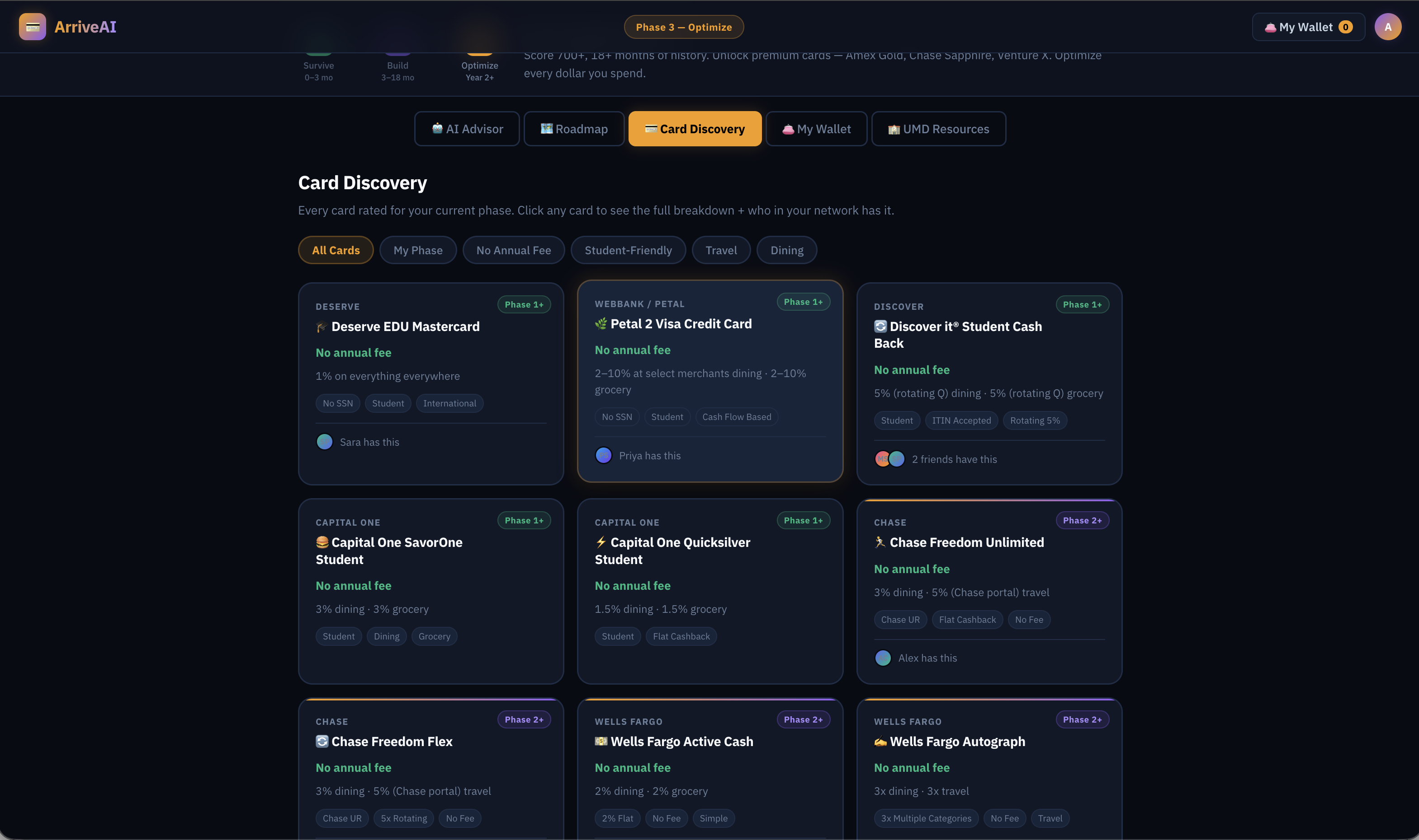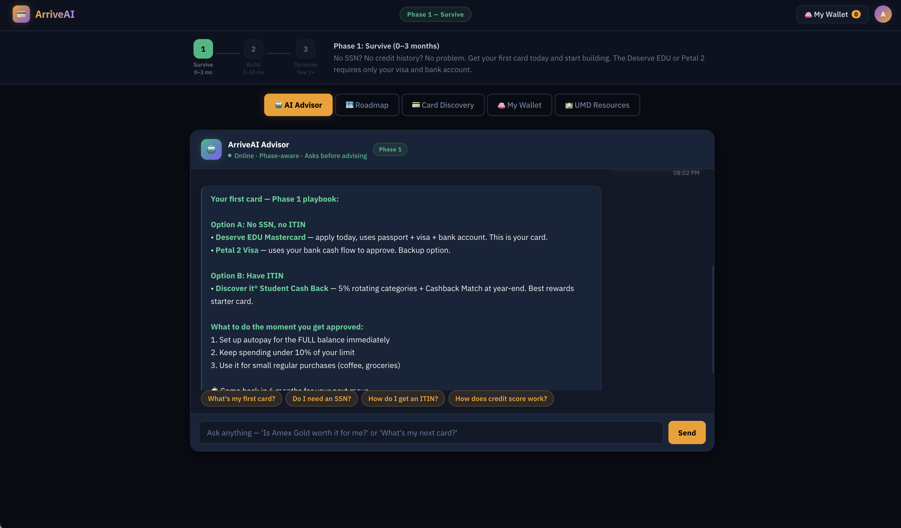 Phase-aware advice is hard. A student with no SSN asking about Amex Platinum needs a redirect. A Phase 3 student needs the full math. Same question, completely different answer — building that context routing without it feeling robotic took real work.
