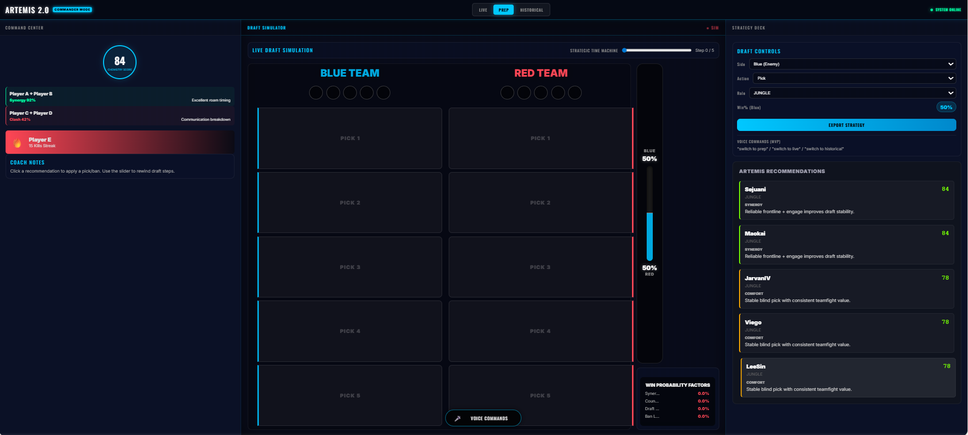 ARTEMIS 2.0 is a real-time League of Legends drafting assistant built to help coaches make faster, smarter, and more explainable decisions during the pick/ban phase. Drafts often decide games, yet they are still driven largely by intuition under intense time pressure. We wanted to change that.