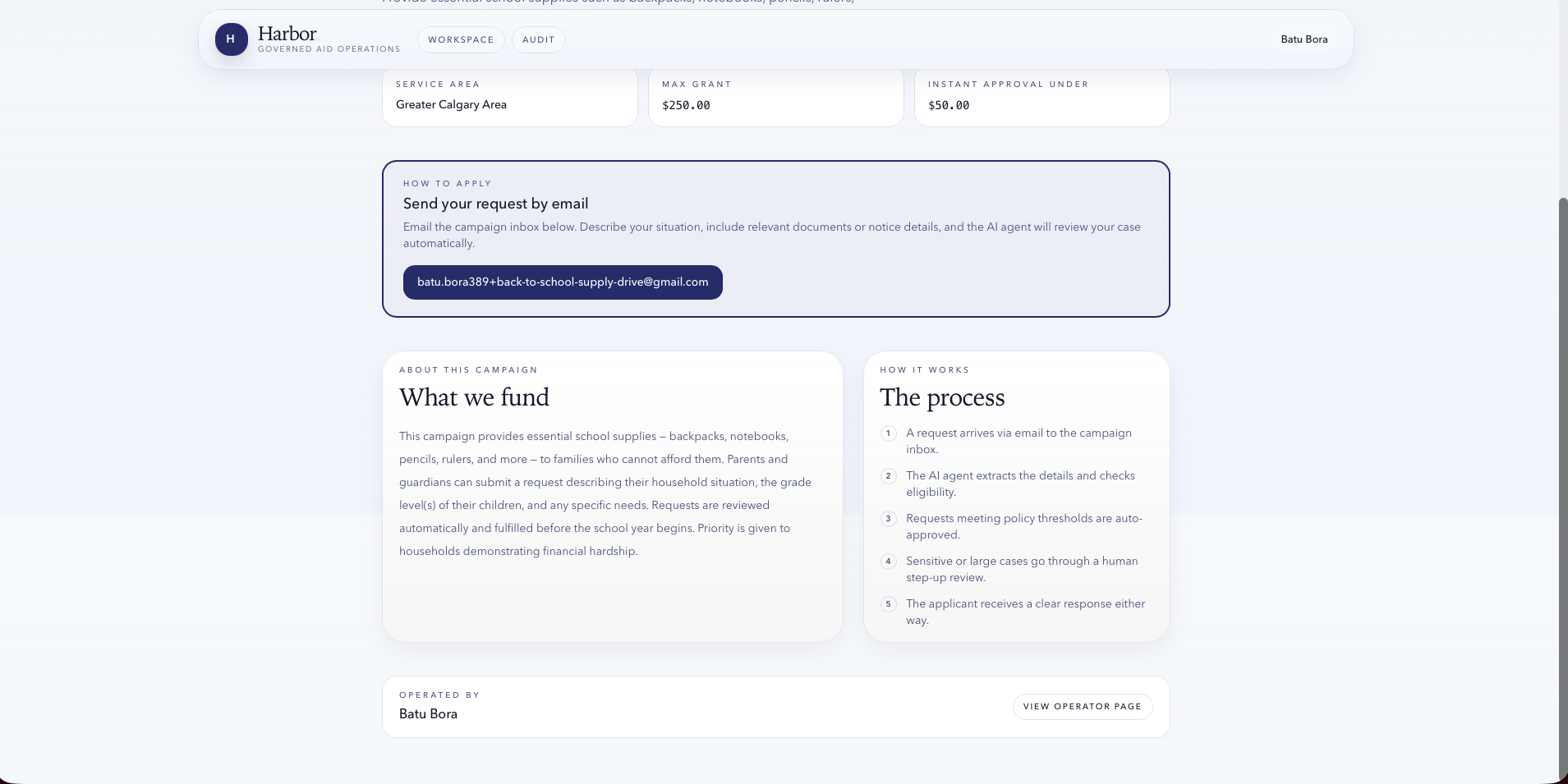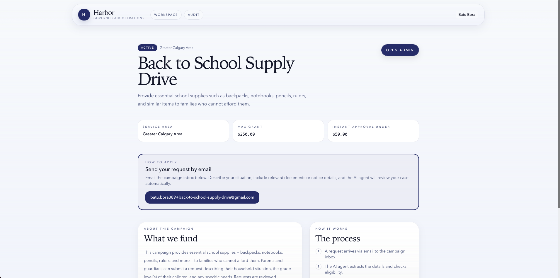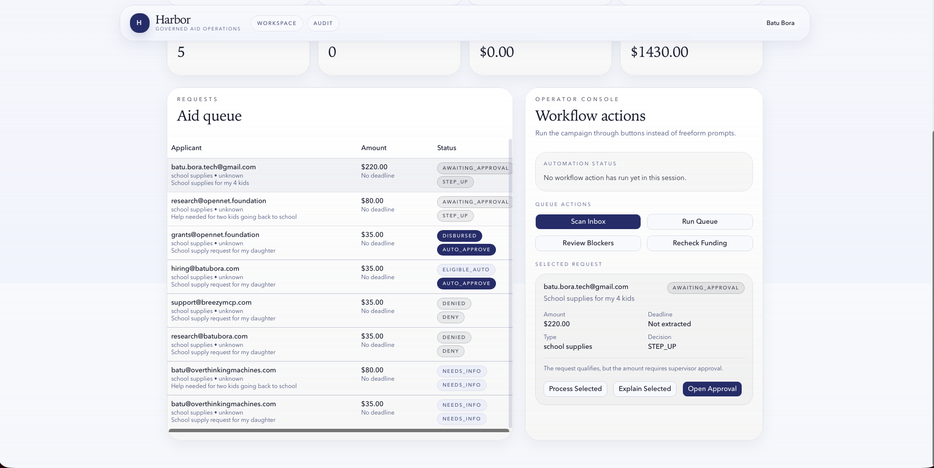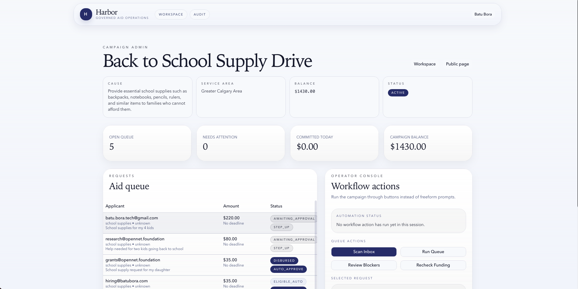 Longer term, we see Harbor as an operating layer for small relief programs: intake, policy enforcement, approvals, auditability, and secure delegated action in one system.