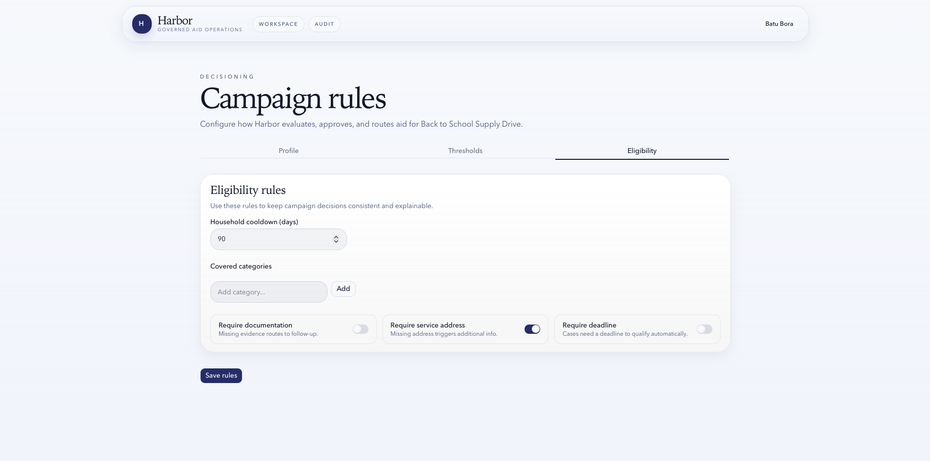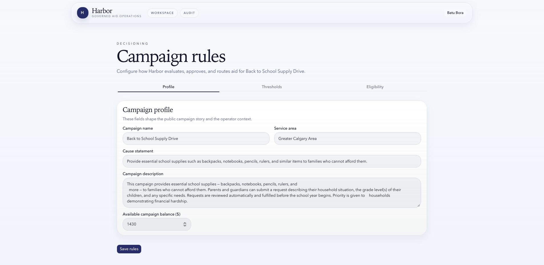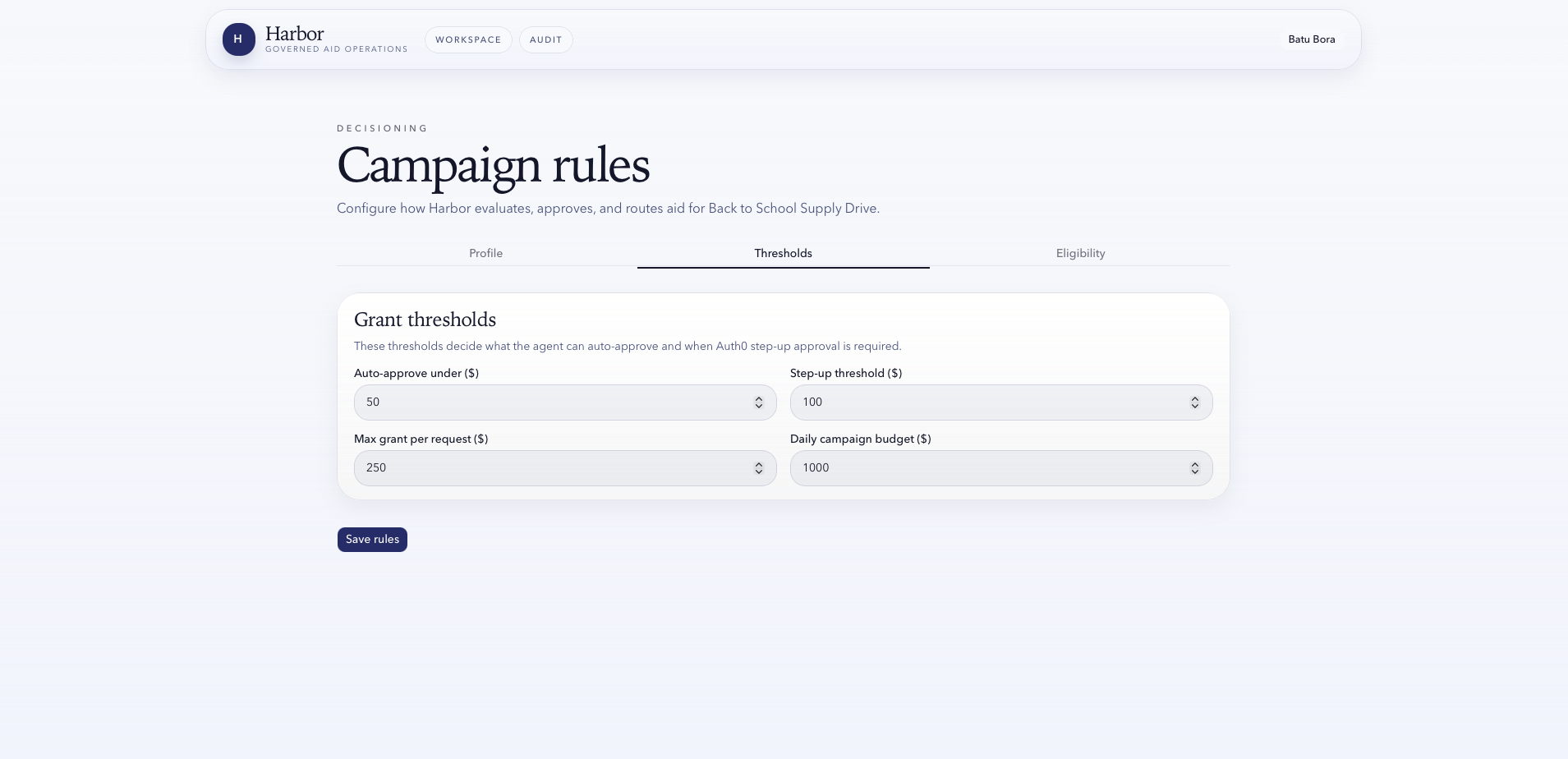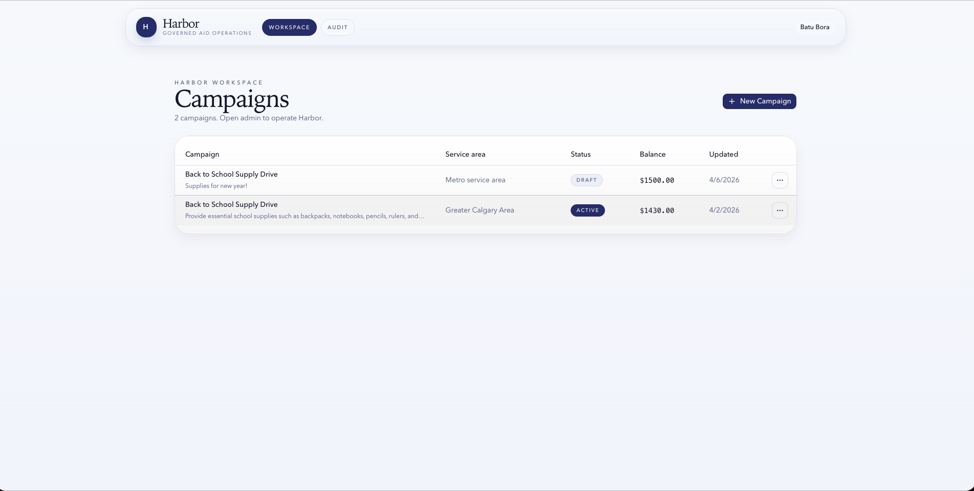 Longer term, we see Harbor as an operating layer for small relief programs: intake, policy enforcement, approvals, auditability, and secure delegated action in one system.