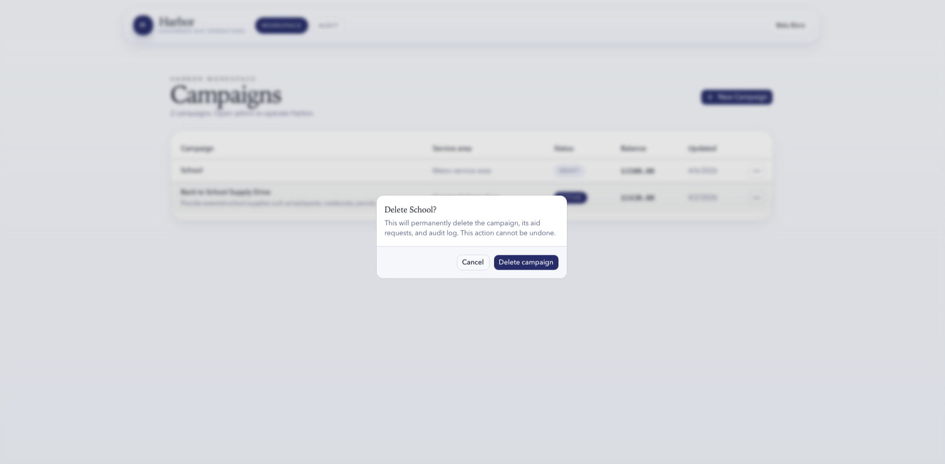 Protected campaign deletion flow that prevents accidental removal of campaign data, requests, and history.