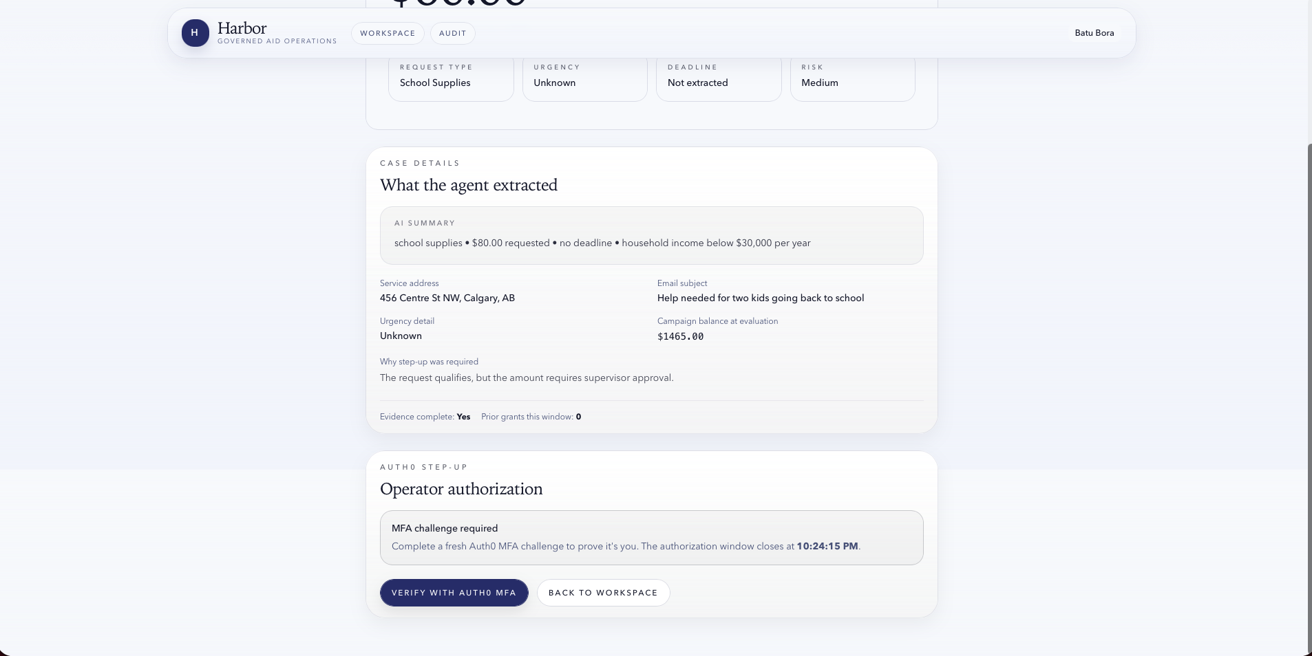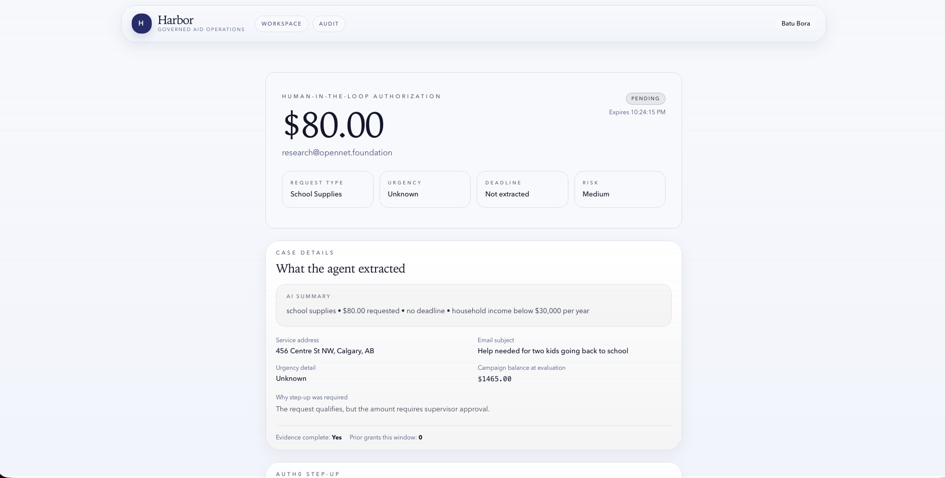 Emergency aid programs often start in the inbox. Organizers read hardship emails, check documents by hand, compare requests against policy, and make judgment calls under time pressure. The work is slow, inconsistent, and hard to audit. We built Harbor to show that an AI agent can speed up the operational work while Auth0 keeps a human in control before anything sensitive happens.