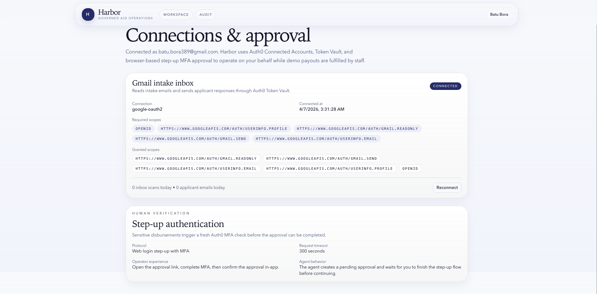 At the same time, Harbor demonstrates a reusable pattern beyond emergency aid. Any agent that acts through a user's email or another delegated API runs into the same problem: how do you let the agent do useful work without turning delegated access into silent, unreviewable automation? The pattern here generalizes well: delegated access through Token Vault, explicit policy boundaries, visible scopes, and step-up authentication before high-stakes actions.