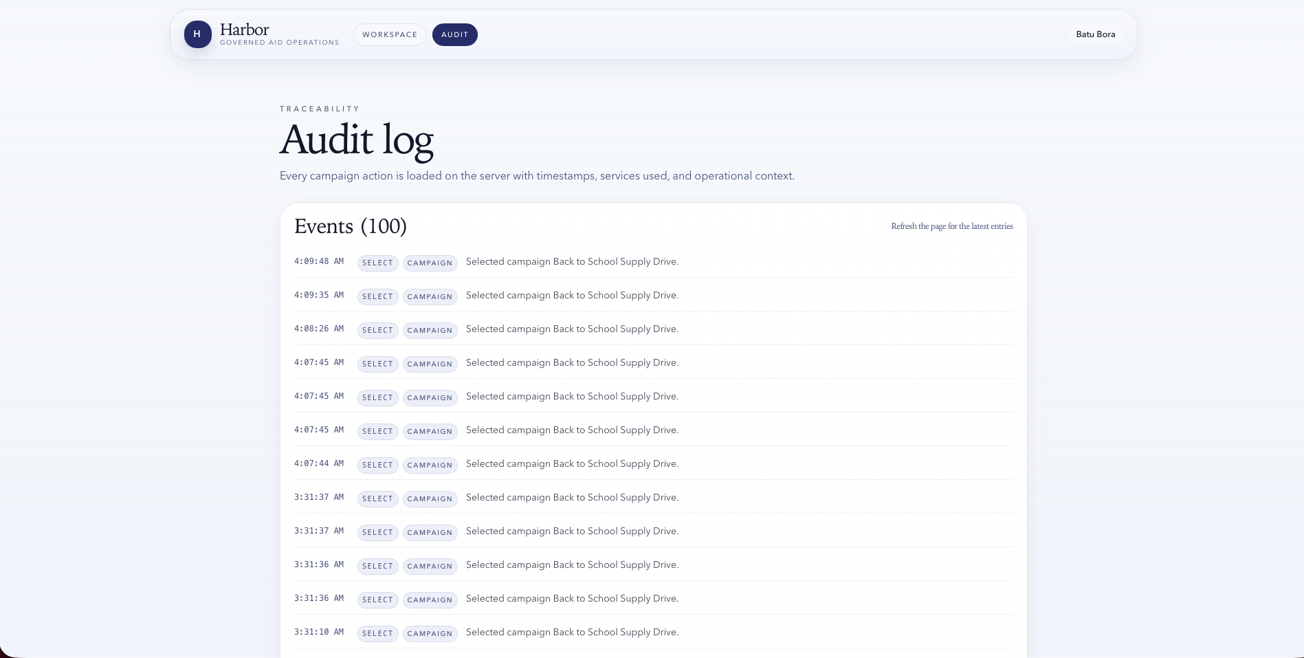 Harbor is an AI operations assistant for emergency relief campaigns.