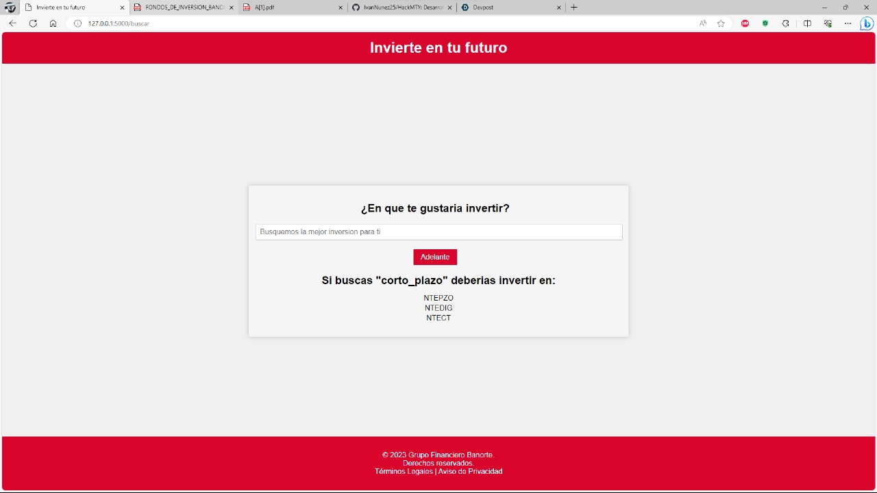 Utilizamos sklearn de Python para una conexión con una pagina web, entrenandolo para poder encontrar cuales serian las mejores alternativas de inversión según las respuestas del perfilado del cliente