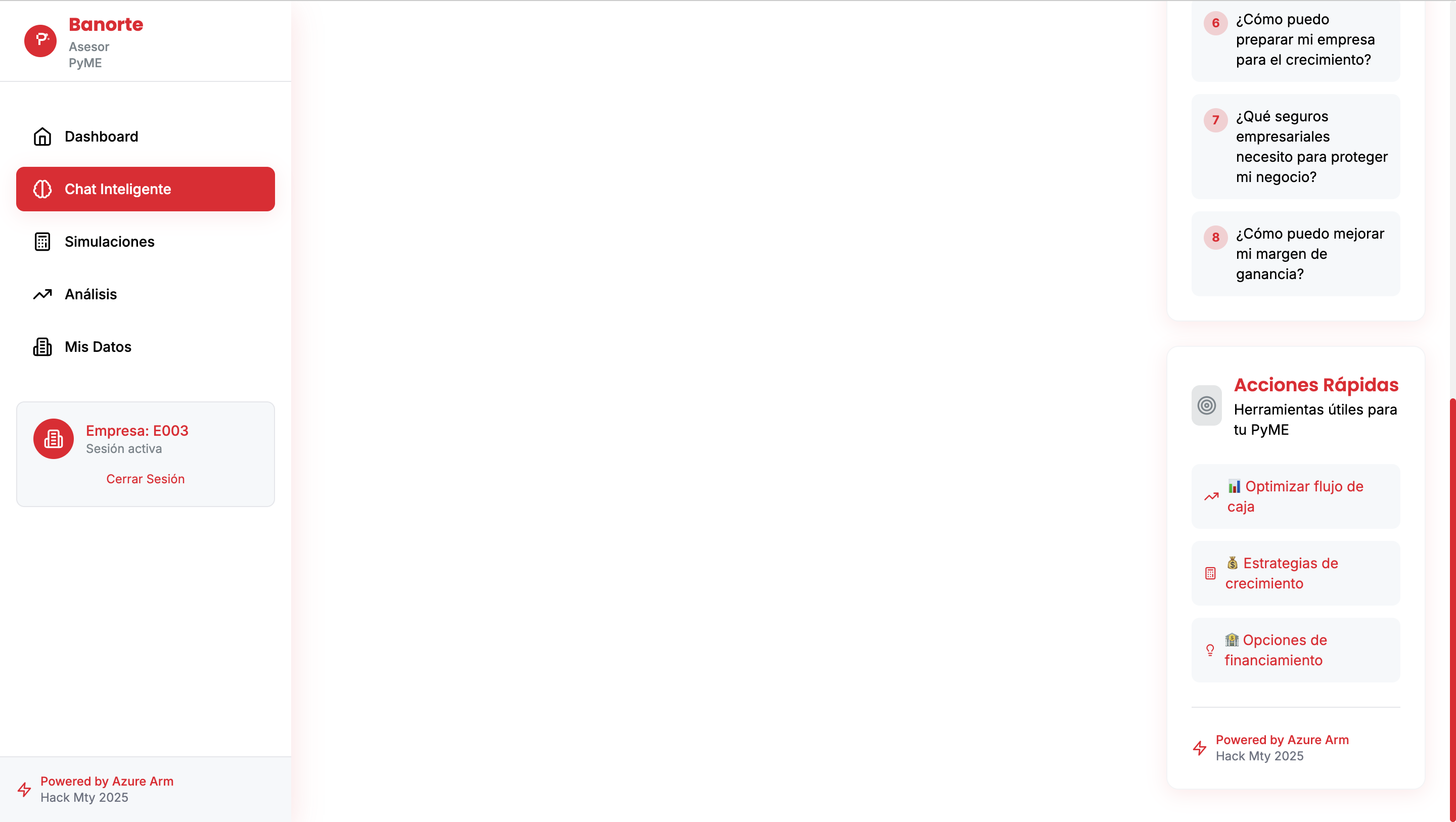 - Asesoría Conversacional Proactiva: El usuario puede preguntar en lenguaje natural ("¿Cómo puedo mejorar mi flujo de caja?") y recibe respuestas personalizadas, análisis de viabilidad, y recomendaciones de productos Banorte, todo con síntesis de voz natural de ElevenLabs.