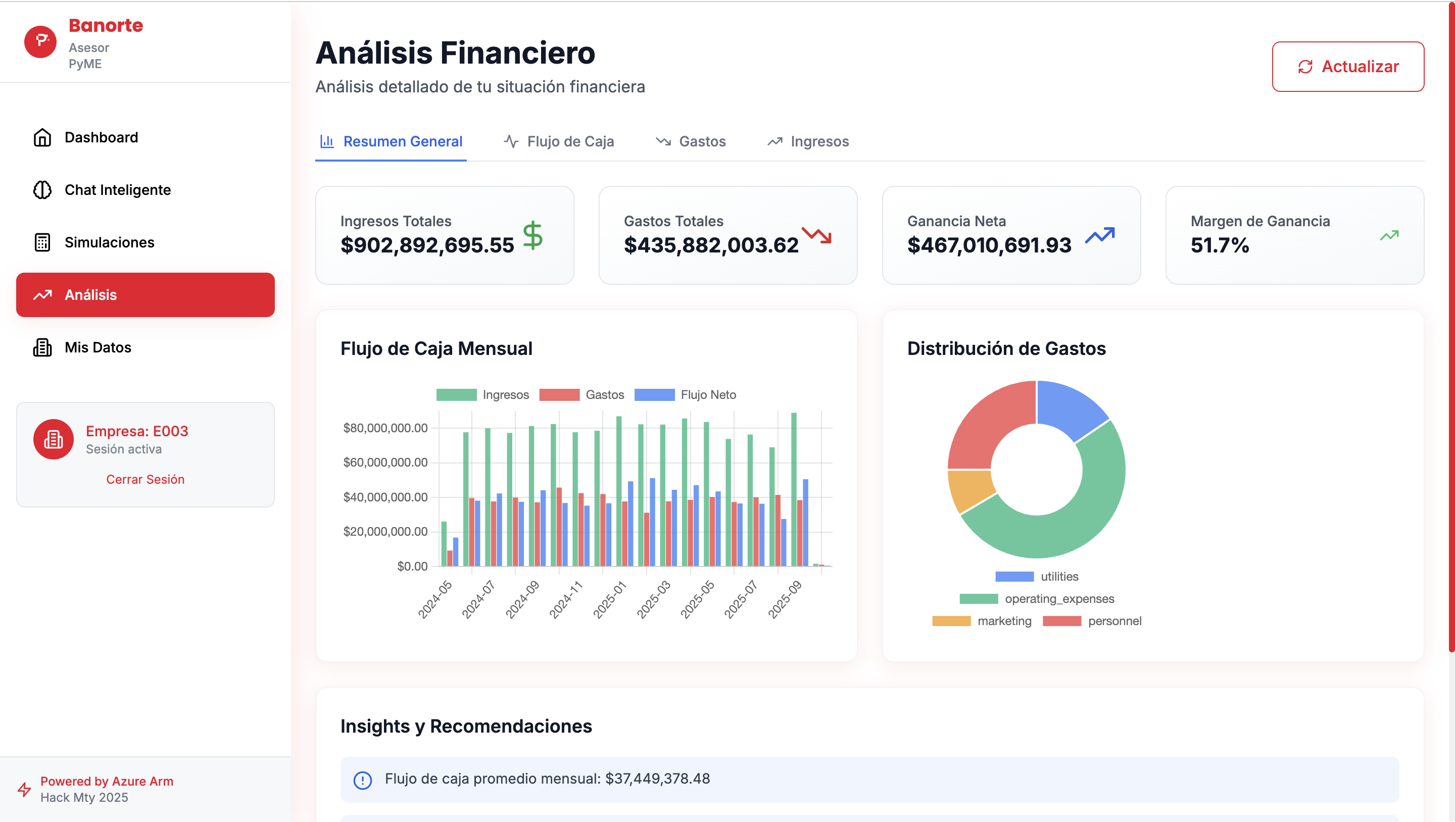 - Frontend: Desarrollado con React y Tailwind CSS (utilizando la paleta de colores Banorte) para una Interfaz de Usuario (UI) intuitiva y responsiva. Se usó Chart.js para las visualizaciones financieras.