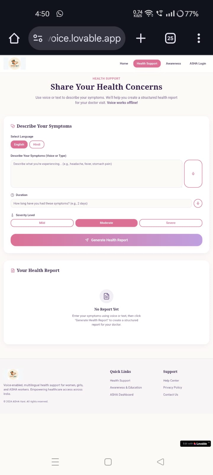 We built ASHA Vani as a multi-platform system. An Android app prototype demonstrates voice interaction and core health modules, while a web-based AI application (built using Lovable) showcases the broader system architecture, UI/UX, and multiple healthcare workflows. The AI logic is designed as a lightweight, explainable system that classifies user input and provides contextual responses. The platform supports multilingual design and modular expansion, allowing easy addition of new health domains and forms.