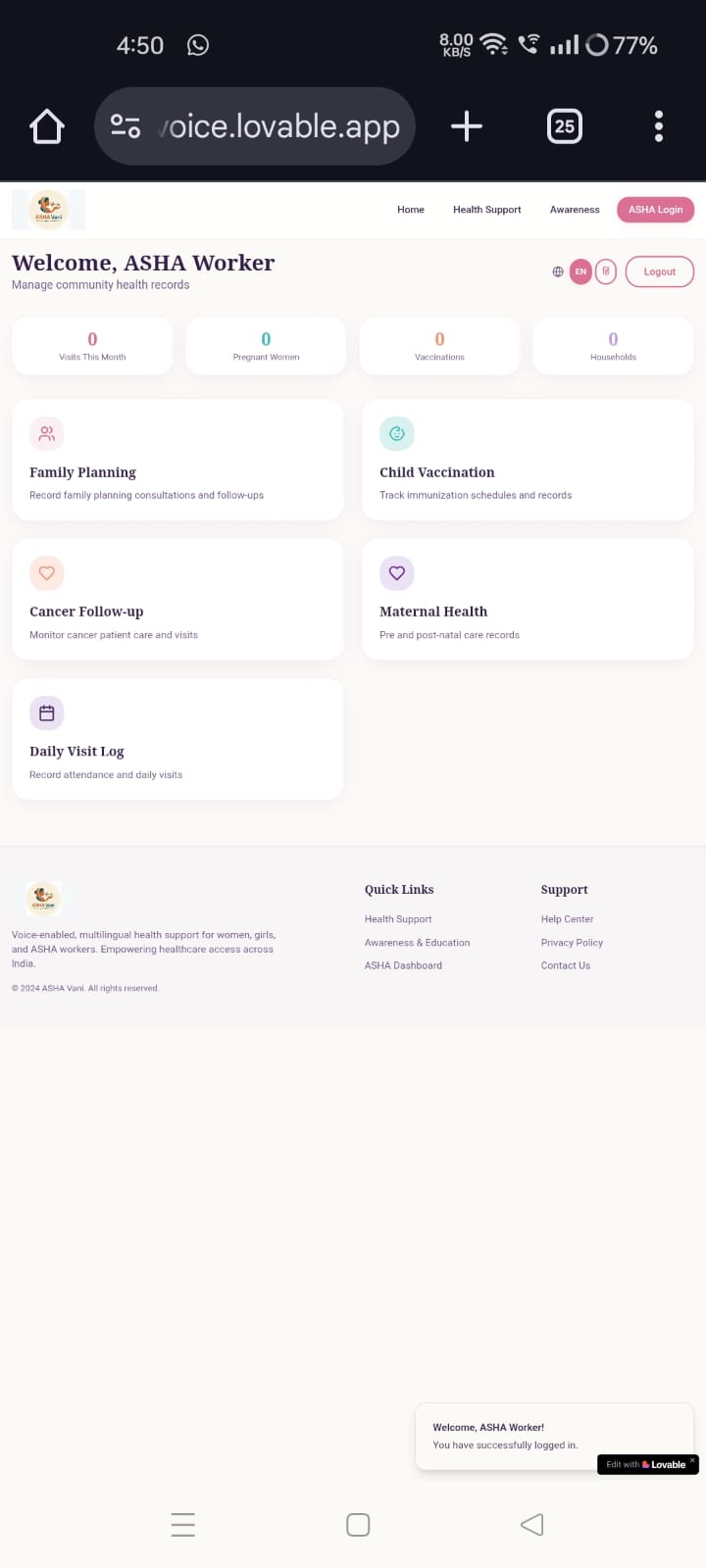 We are proud of building a working, socially relevant prototype that goes beyond a single-feature app. ASHA Vani demonstrates real-world feasibility by combining AI guidance, voice interaction, multilingual access, and operational healthcare forms. Most importantly, the project addresses a sensitive problem with empathy, inclusivity, and practical design.
