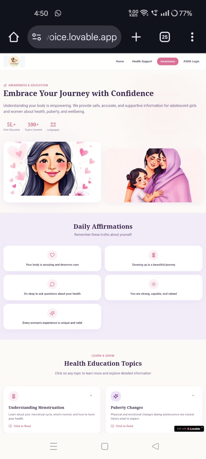 ASHA Vani is a voice-first, multilingual AI health platform designed for two user groups. For adolescent girls and women, it provides AI-based guidance on puberty, menstrual health, and basic well-being through voice or text in their preferred language. For ASHA workers, it offers structured digital forms for tasks such as attendance, family planning, child vaccination, and patient tracking, helping reduce manual effort and improve accessibility.