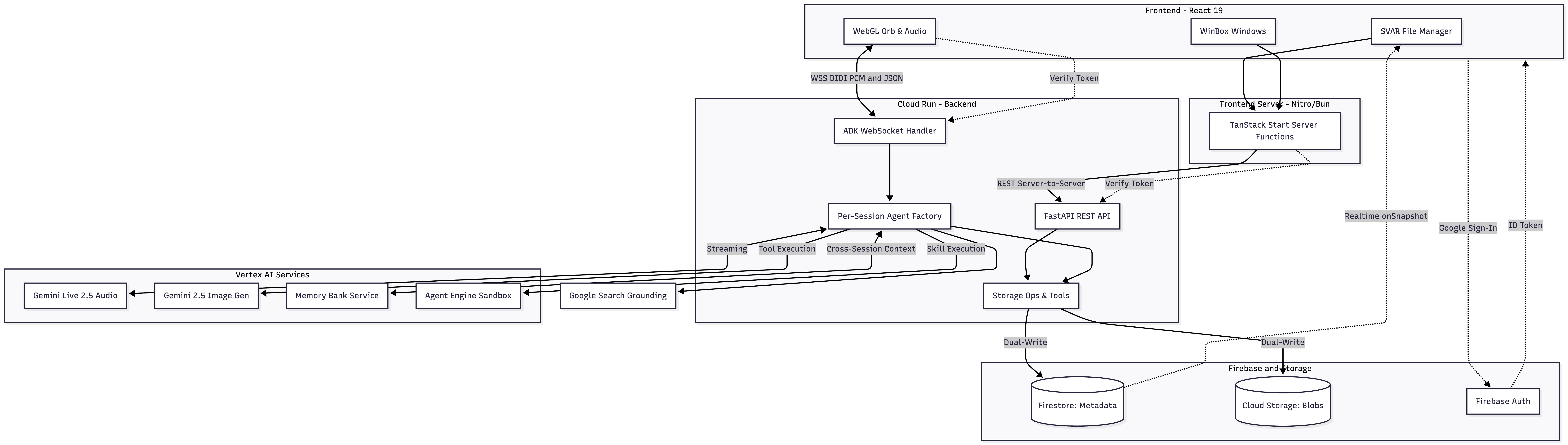 A voice-first AI assistant built with Google ADK (Agent Development Kit) and the Gemini Live API. Features real-time bidirectional voice streaming, long-term memory across sessions, a file manager with floating editor windows, user-extensible agent skills, image generation/editing, and Firebase-backed storage -- all deployed to Google Cloud.