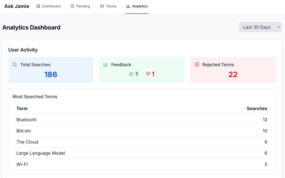 - Data Flywheel: All new terms and their LLM-generated explanations are logged in a pending review system, forming a "data flywheel." This continuous feedback loop allows for human review and validation, continuously improving the quality and accuracy of Jamie's explanations over time.