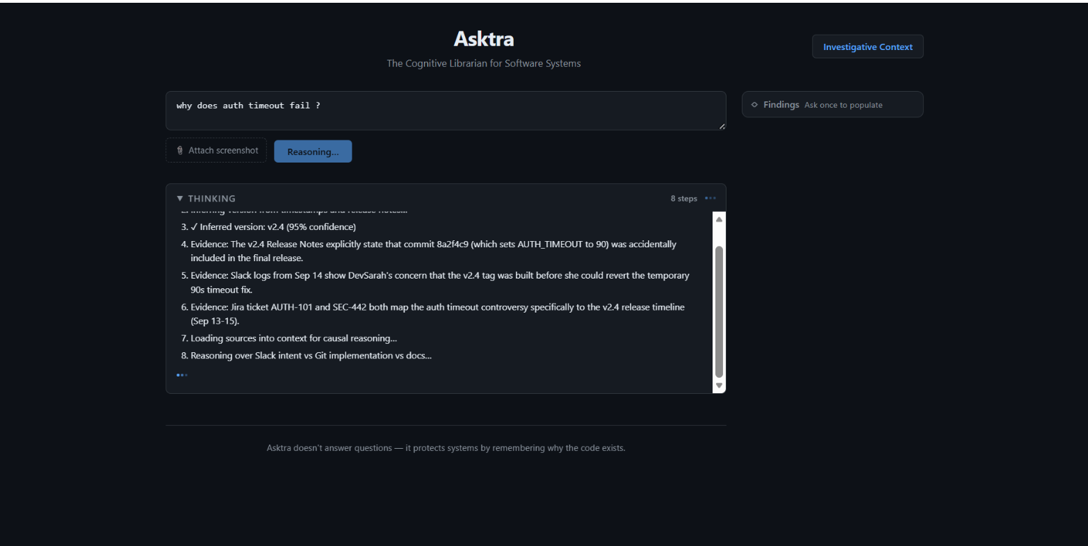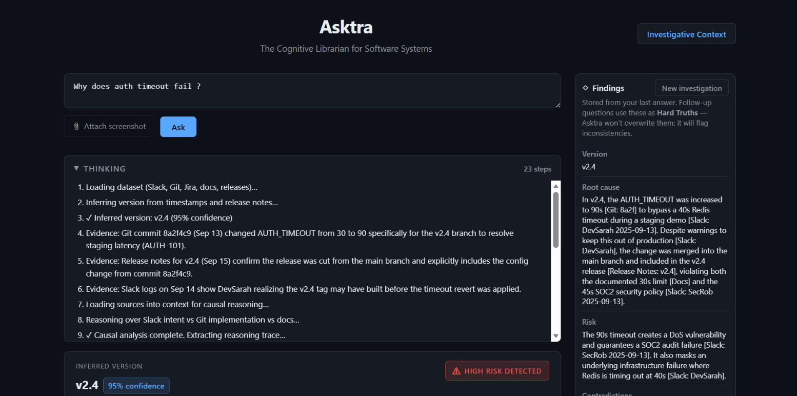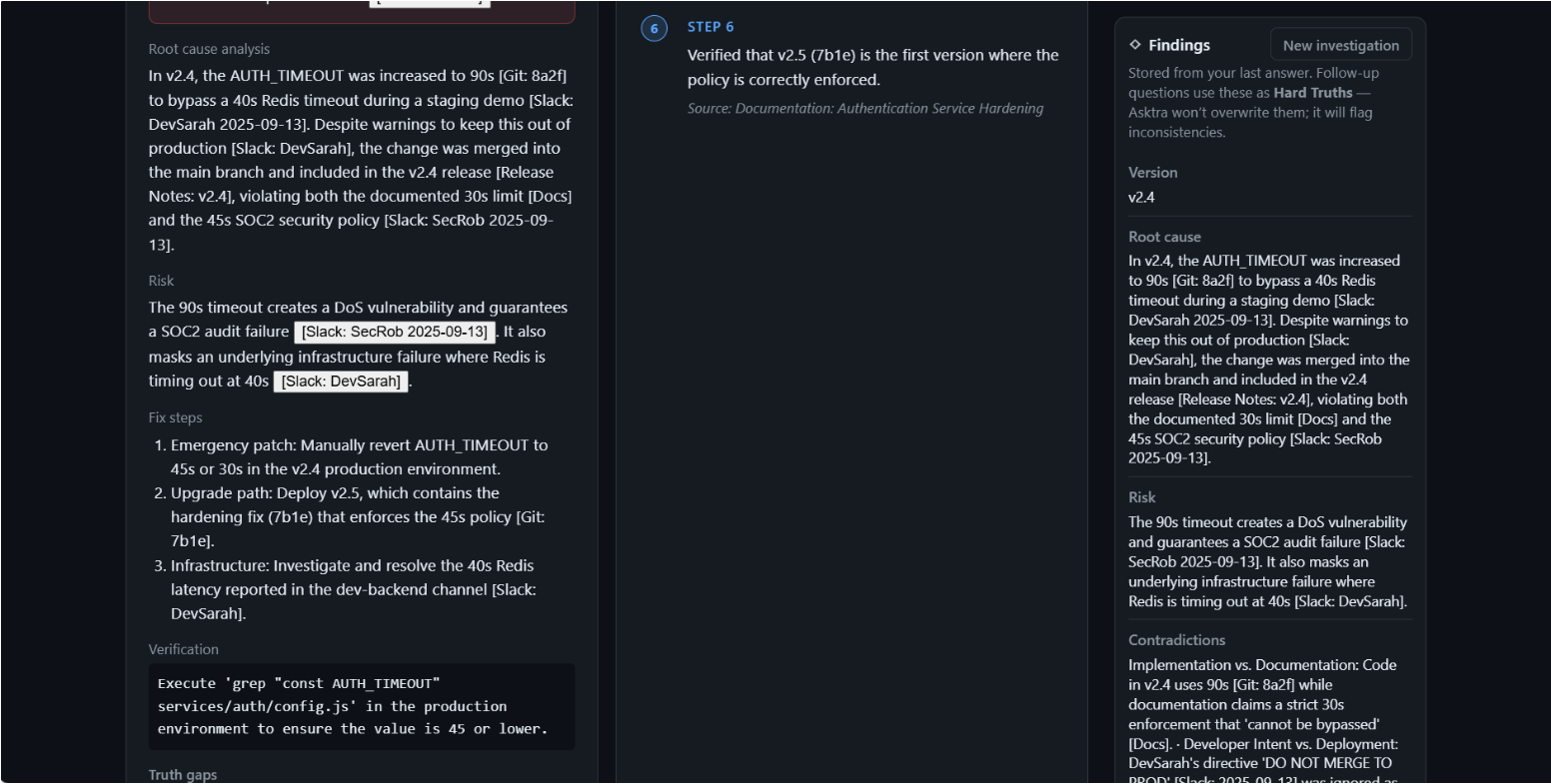 We also learned the importance of Human-in-the-Loop design. Asktra doesn’t replace engineers; it acts as an Investigative Co-pilot, presenting evidence and reasoning for human authorization.