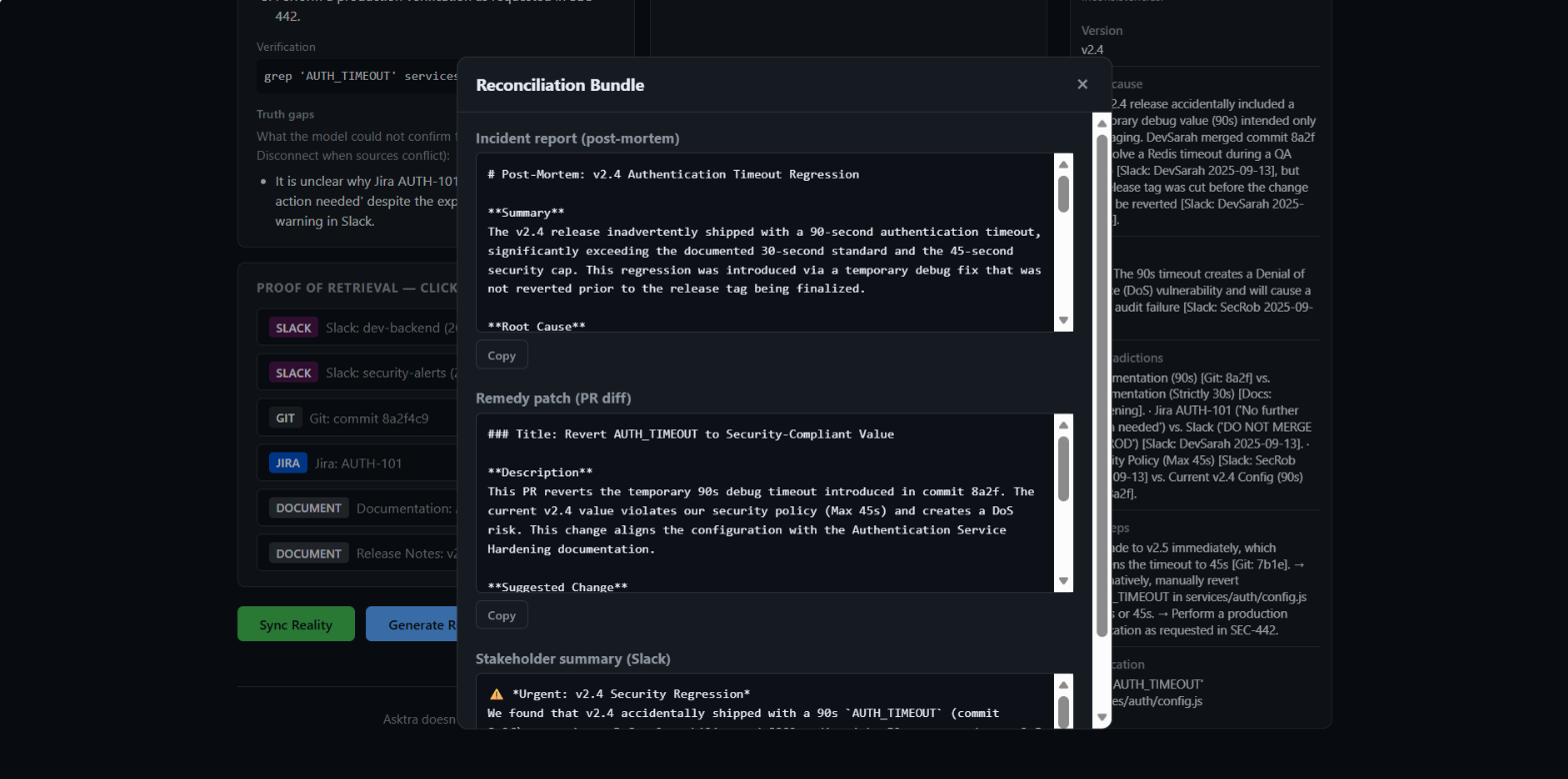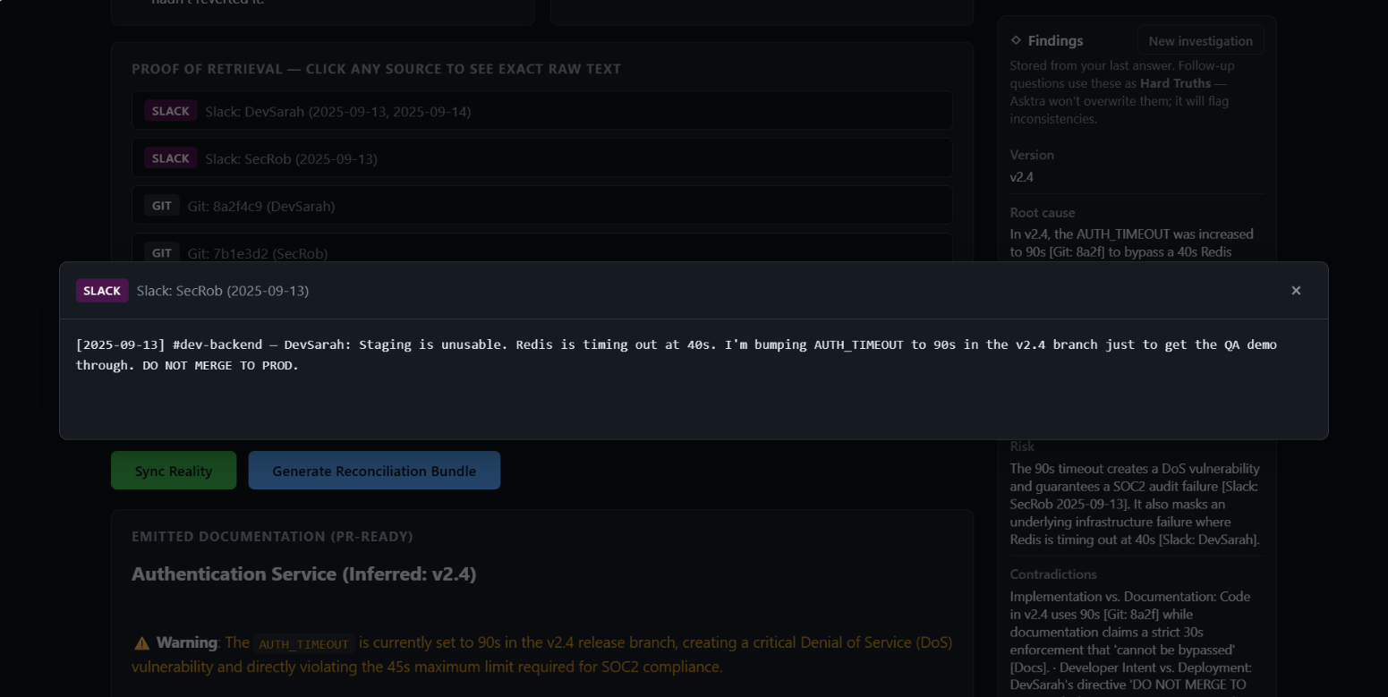 We were inspired to build Asktra after repeatedly watching teams spend 70% of their time playing forensic detective — digging through chaotic chat logs and stale documentation just to understand why a critical security setting was changed months ago.
