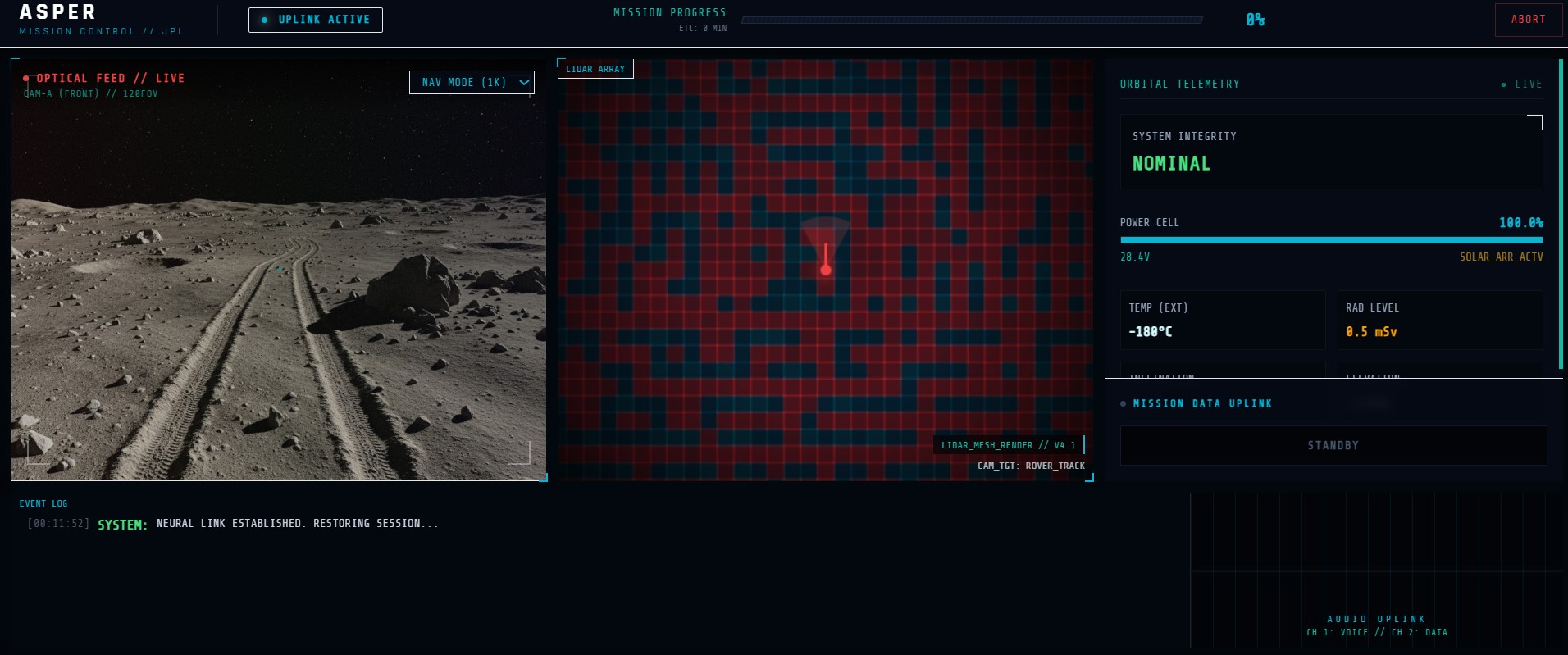 - Elemental Sample Collection: The lunar soil is rich in compounds such as basalt, ilmenite, and olivine, among many other smaller traces. We included the three aforementioned ores as recognized potential samples ASPER-I can identify along its route and store in its handy inventory. Currently, samples are identified based on geological probabilities and terrain densities, paired with visual markers from the Nano Banana-generated live-feed frames. We will discuss the future potential of this feature in the headings below.