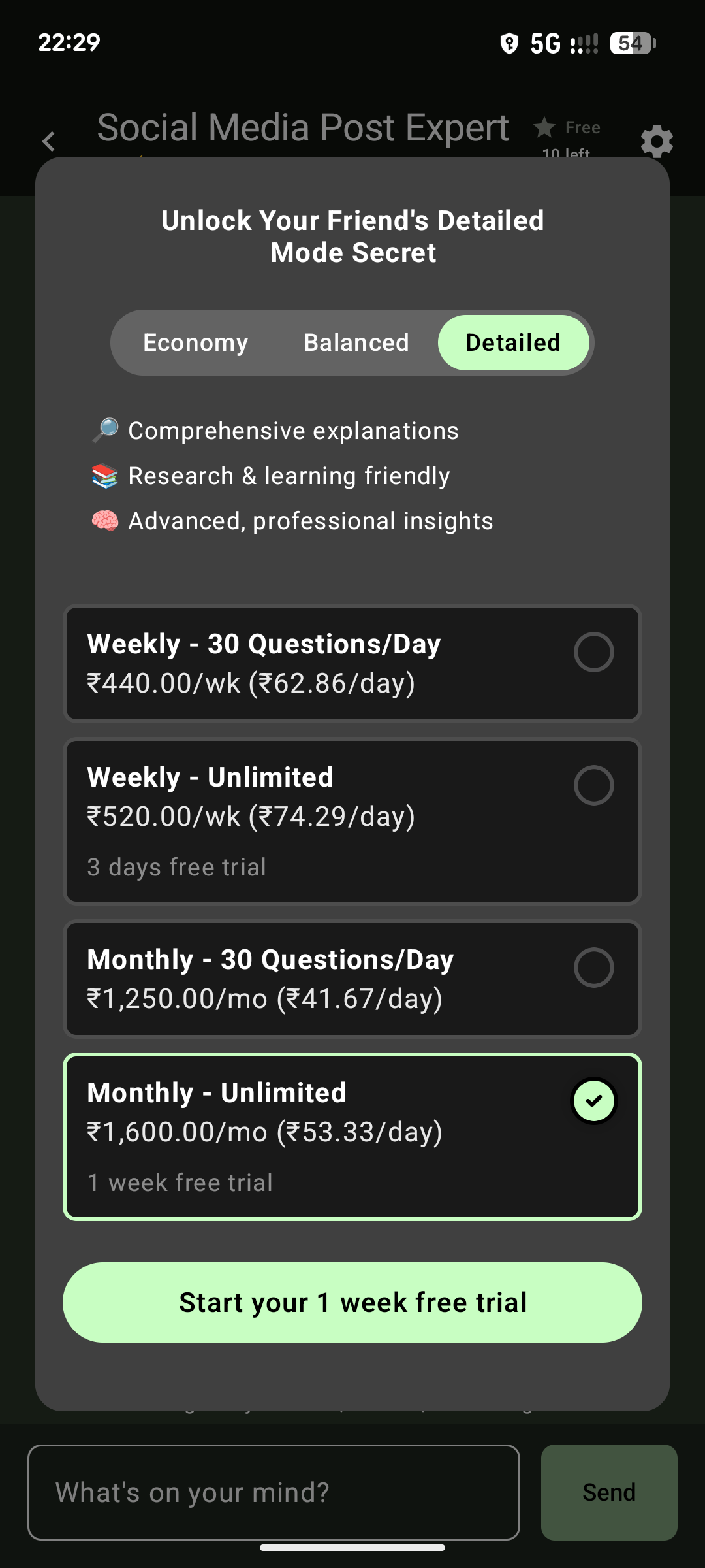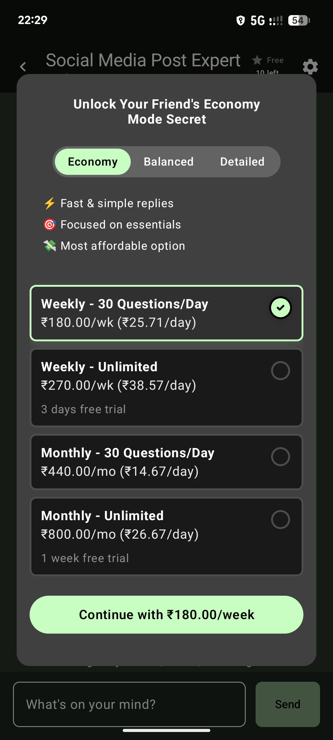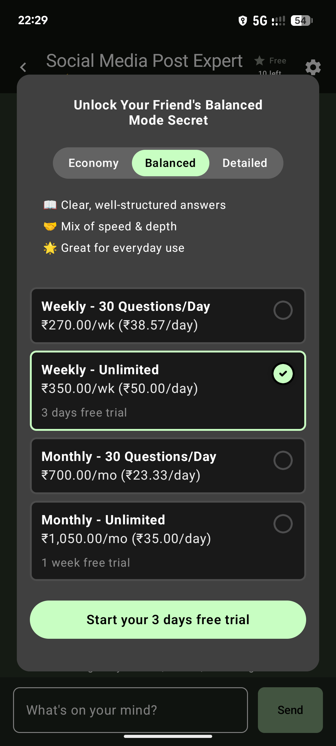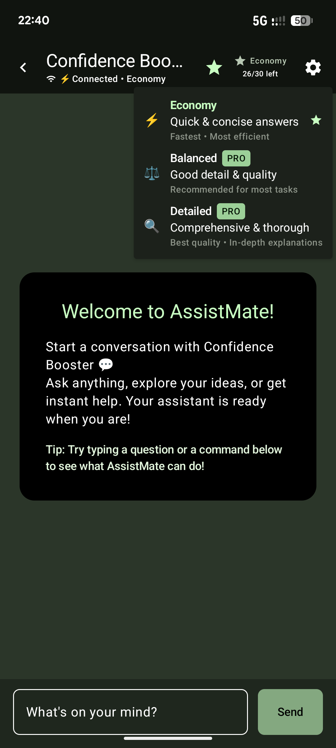 - Choose from three modes based on your needs: Economy: Fast, simple replies (free, 10 questions/day) Balanced: Clear, well-structured answers Detailed: Comprehensive, professional insights
