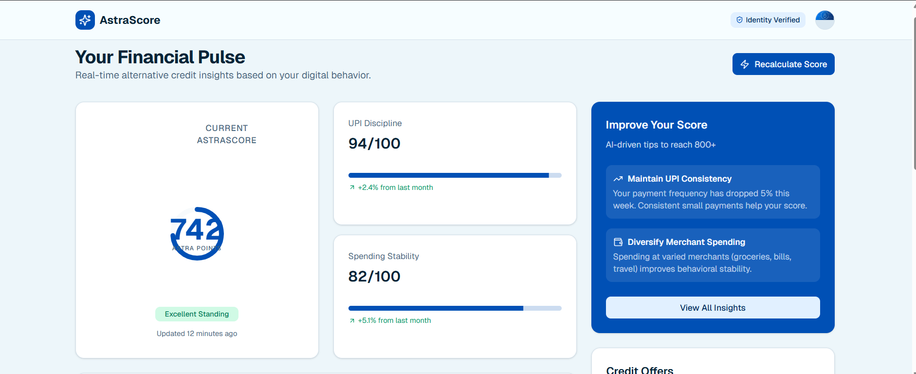 This project proposes AstraScore, an AI-powered alternative credit scoring system that evaluates risk using non-traditional signals such as UPI transaction behaviours, bill payments, savings patterns, recurring expenses, geolocation stability, mobile metadata, and digital behavioural signals. The solution uses machine learning classification models, supported by explainable AI (XAI), to generate a fair, transparent, and real-time credit score.