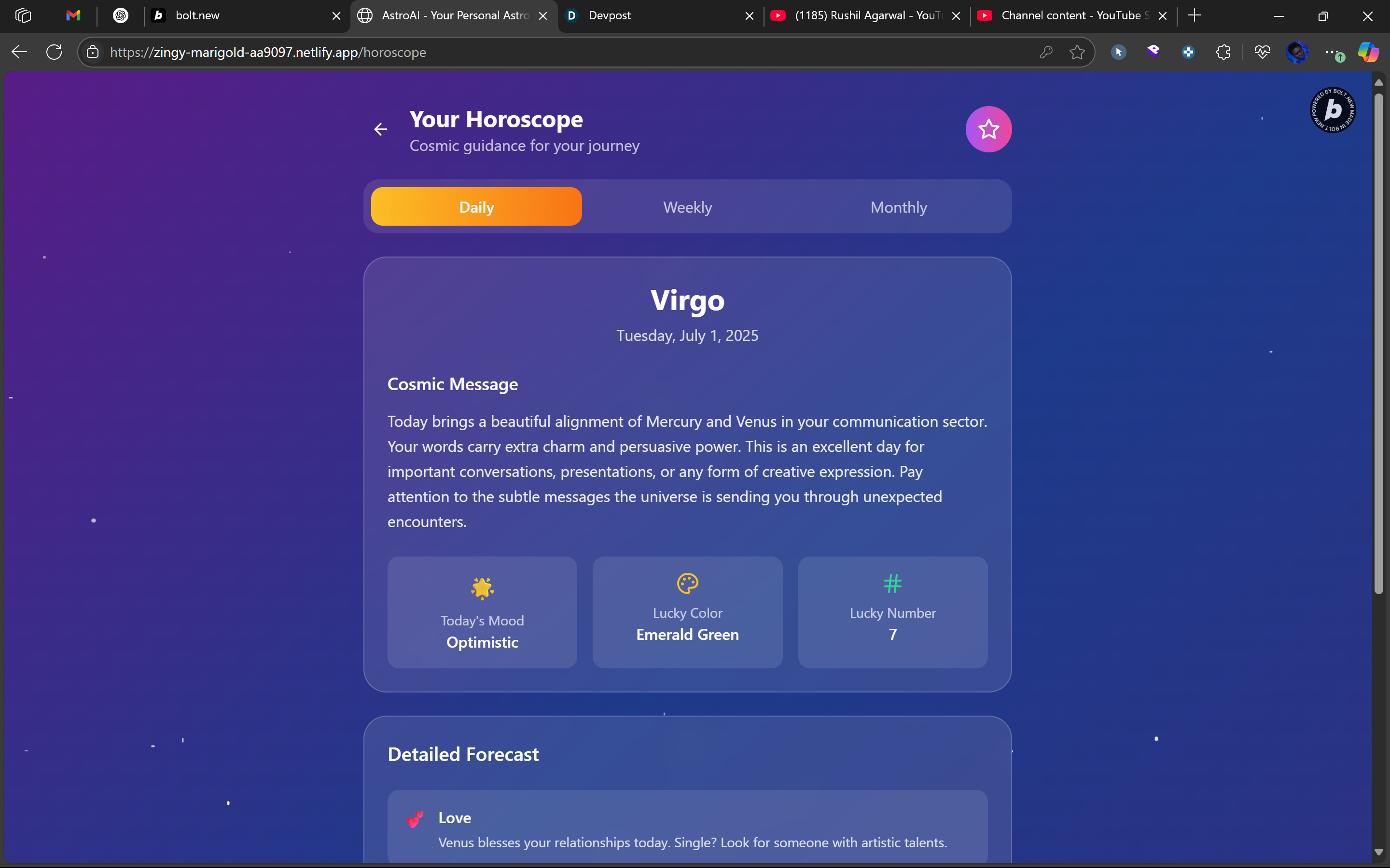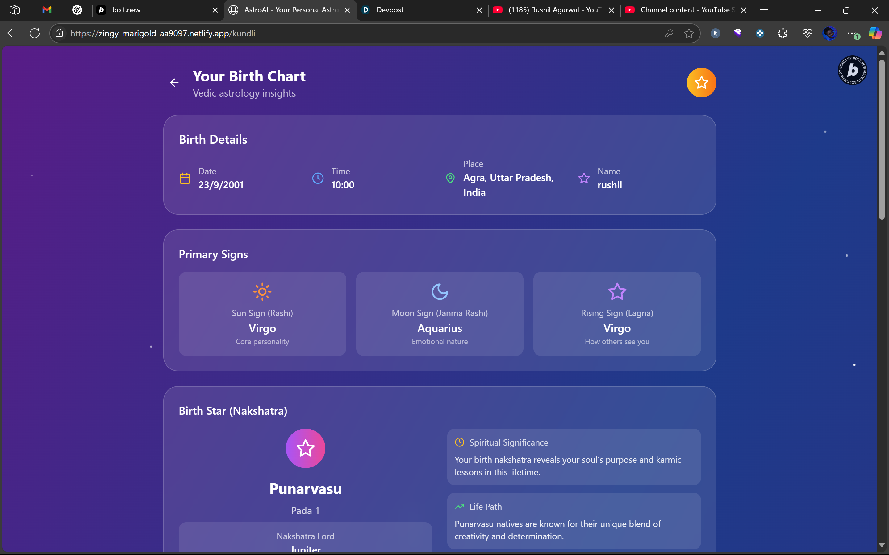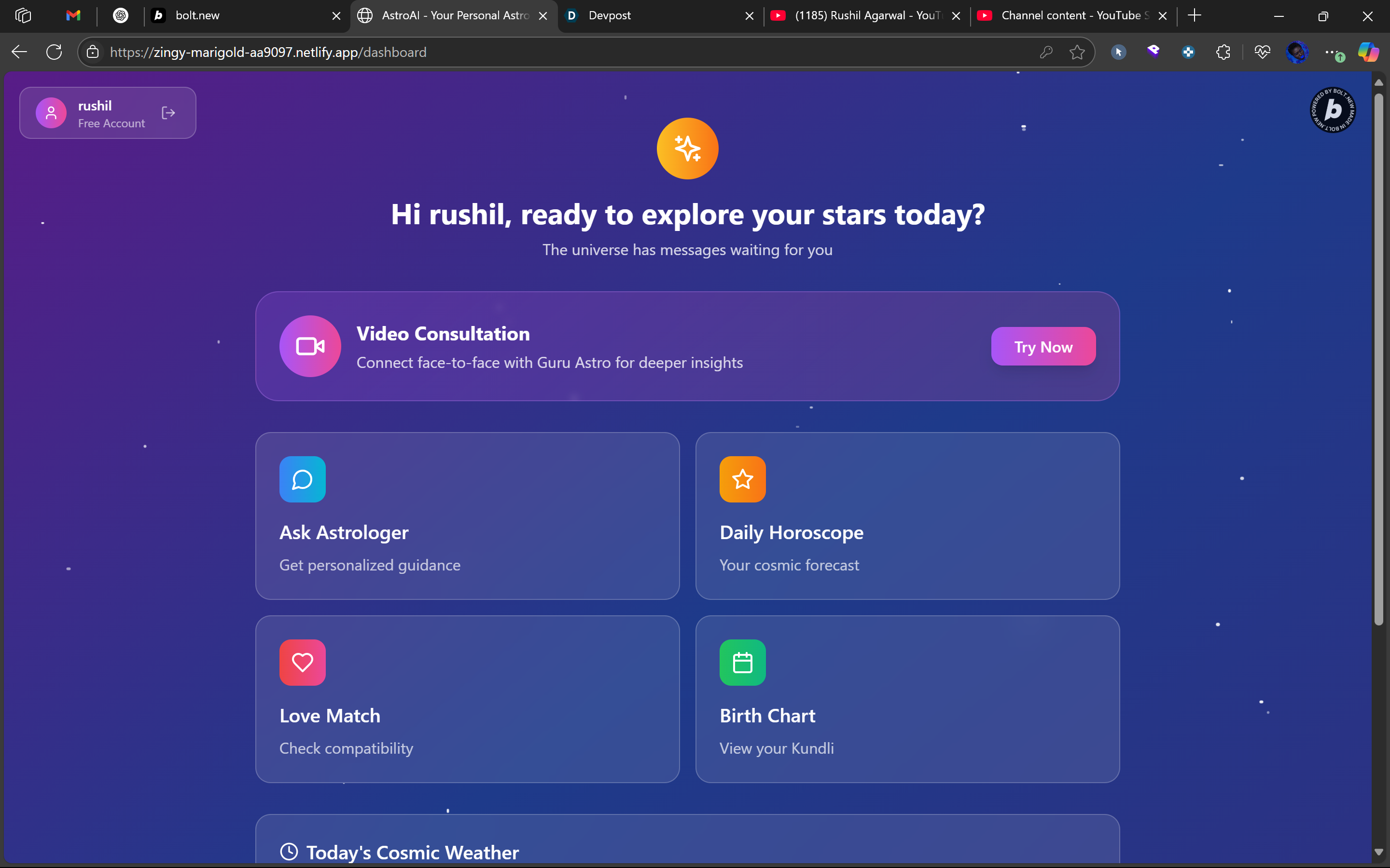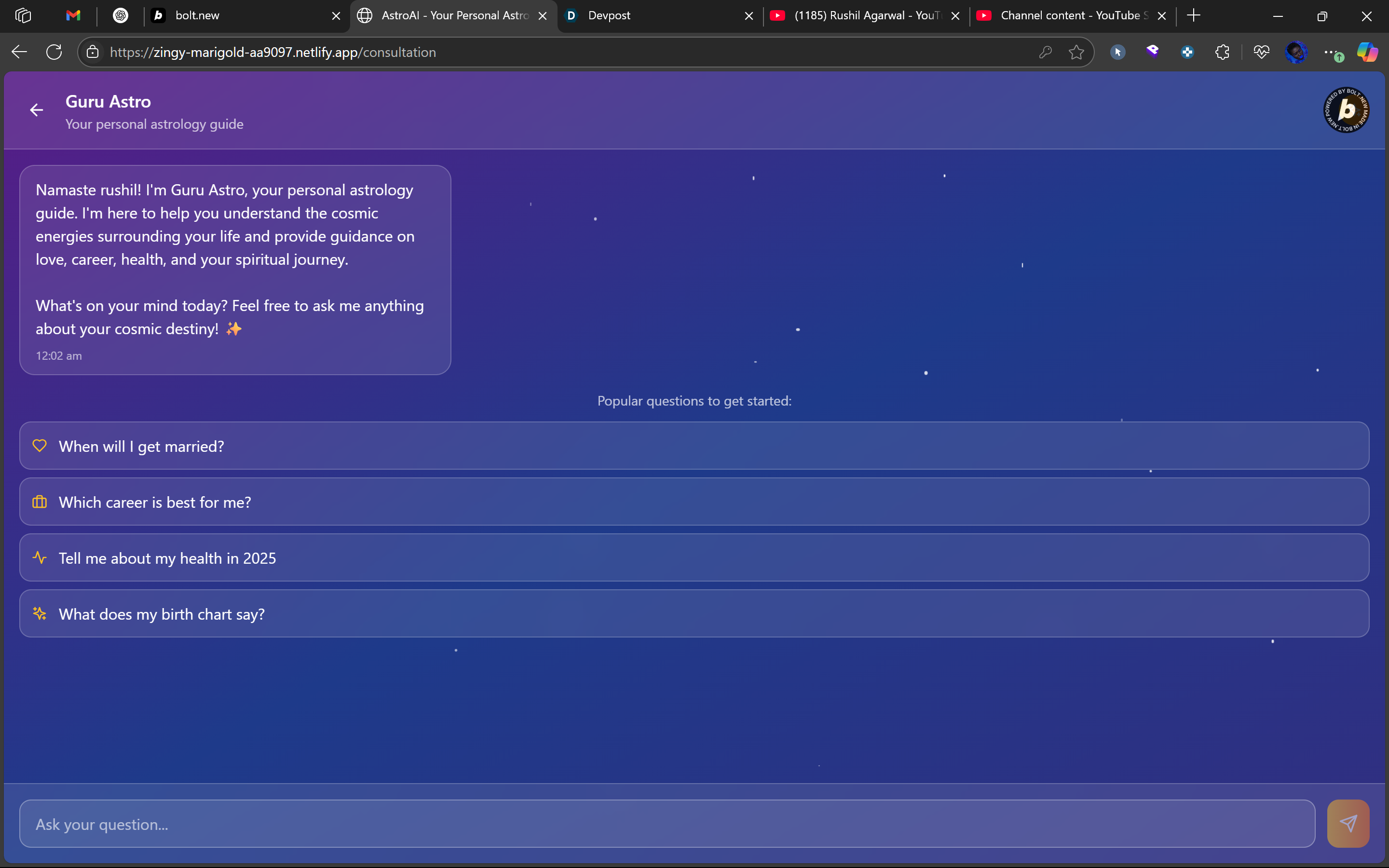 I observed a growing interest in astrology among Gen Z and millennials, but the experience of consulting astrologers online is often inconsistent, expensive, and unscalable. I wanted to create something more intuitive - a personalized, always-available astro guide powered by AI. The goal: make astrology consultations as seamless and accessible as a Spotify playlist.