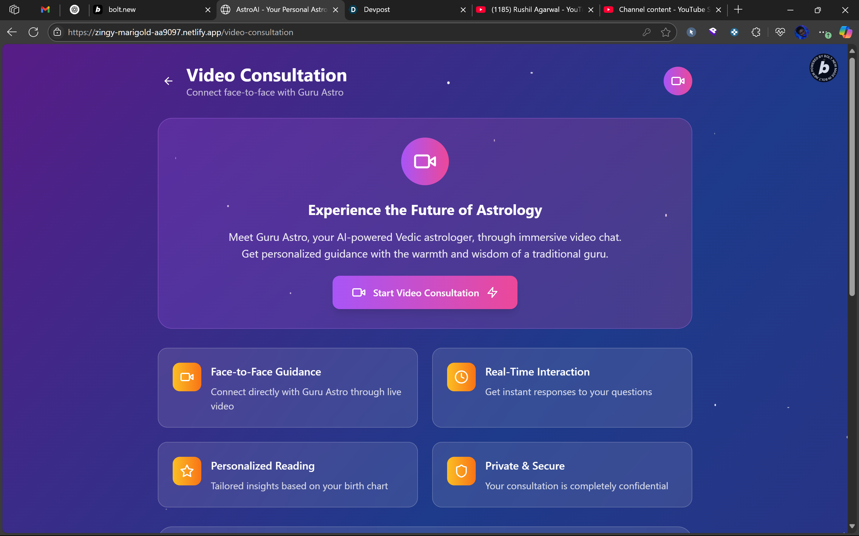 Hosts video consultations with an AI avatar that speaks directly to you. Generates real-time kundli and horoscope charts using your birth details. Offers compatibility and life event predictions. Integrates multiple AI services (OpenAI, ElevenLabs, Tavus) to create a holistic user experience.