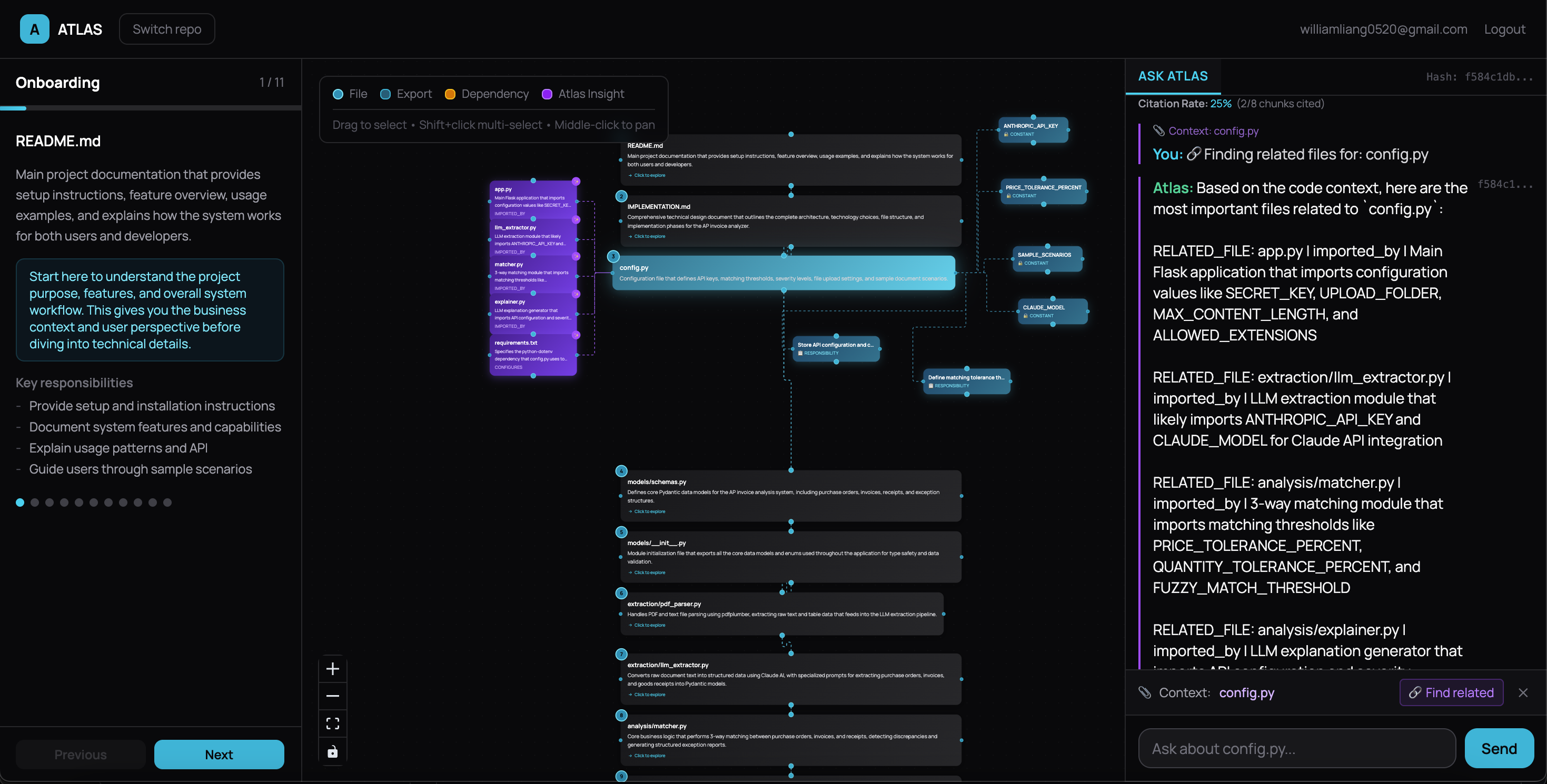 Atlas mimics the "second brain" philosophy, like Notion or Obsidian. Instead of context-switching between files and manually finding resources, there is a uniform interface that draws visual connections between onboarding resources into a graph. Through integrating their Github, the user can get a visual and interactive map of the codebase to guide their onboarding, which then uses Claude to rank files from 0–10 on score importance. This allows the user to only focus on the logic that actually matters. Atlas also generates logical onboarding paths for new devs, following the flow from entry points to utilities. If the user has any questions, ask Atlas: a chatbot window that can interact with the visuals, verified by line-by-line citations and accuracy checks.