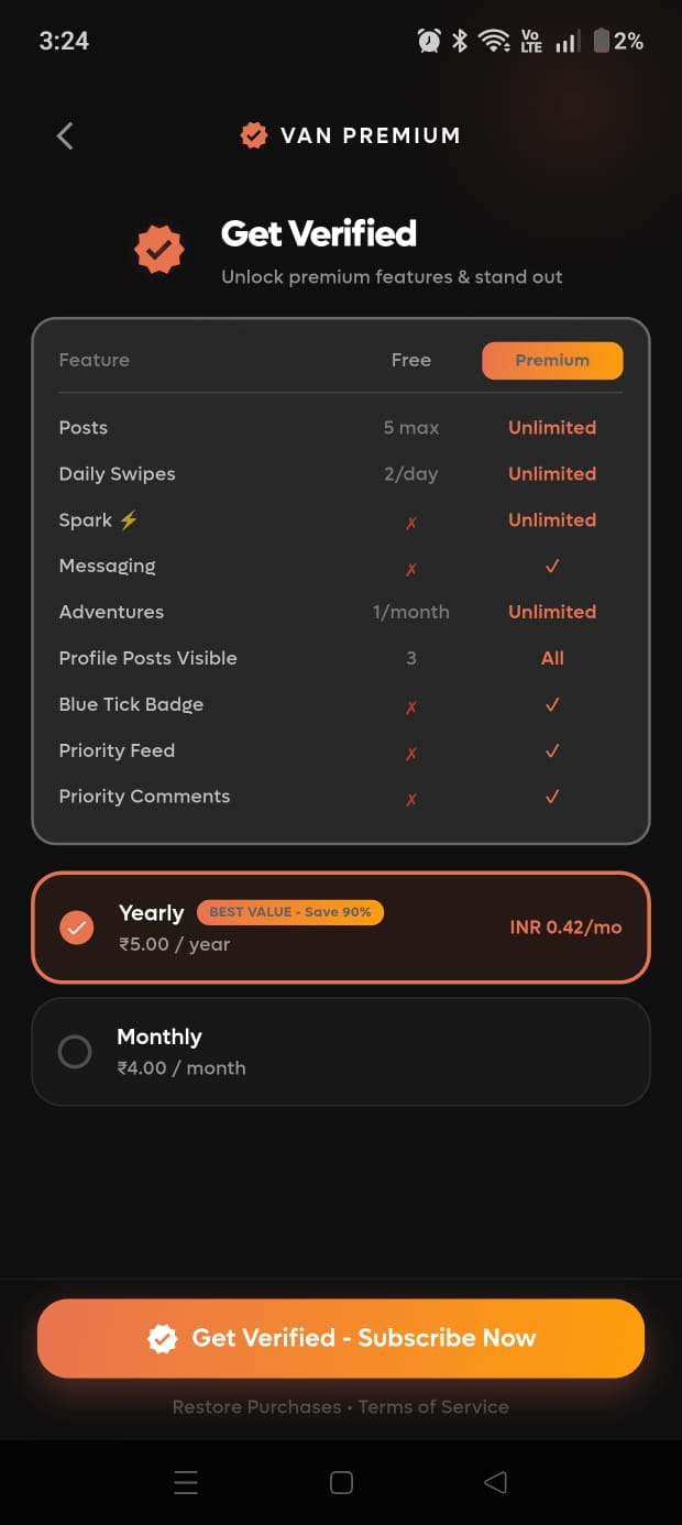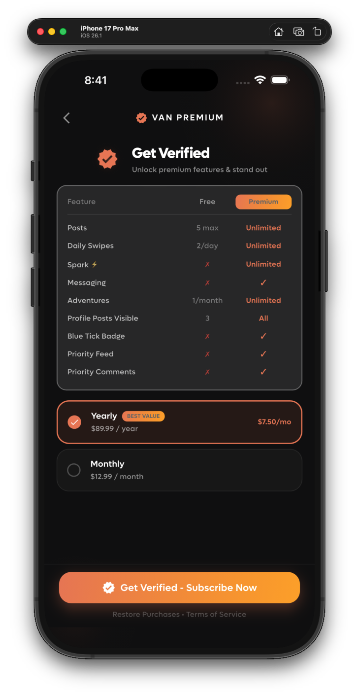 - Trust Layer — Invite-only access, multi-tier verification, privacy controls, and RevenueCat-powered premium subscriptions