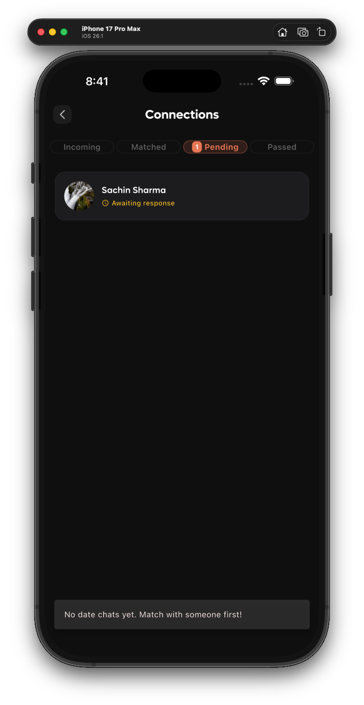 Frontend: Flutter 3.10+ with Provider state management. 37+ screens across auth, dating, social, maps, and premium flows. 17 providers manage app state, 14 services handle API communication, and 15 reusable widgets power the UI. Hive caches offline data, Dio + JWT interceptor handles secure API calls, ScreenUtil ensures responsive design across all devices.