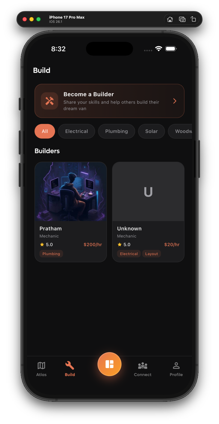 Traditional dating apps assume you're stationary. By the time you match with someone, exchange messages, and plan to meet, you've already moved to the next state. Making friends is a needle-in-a-haystack problem when you're always moving. And finding trusted expertise to help with van conversions is fragmented across Reddit threads, Facebook groups, and word-of-mouth recommendations.