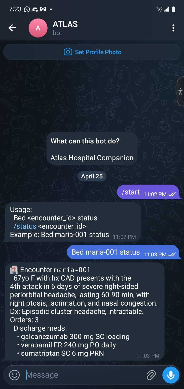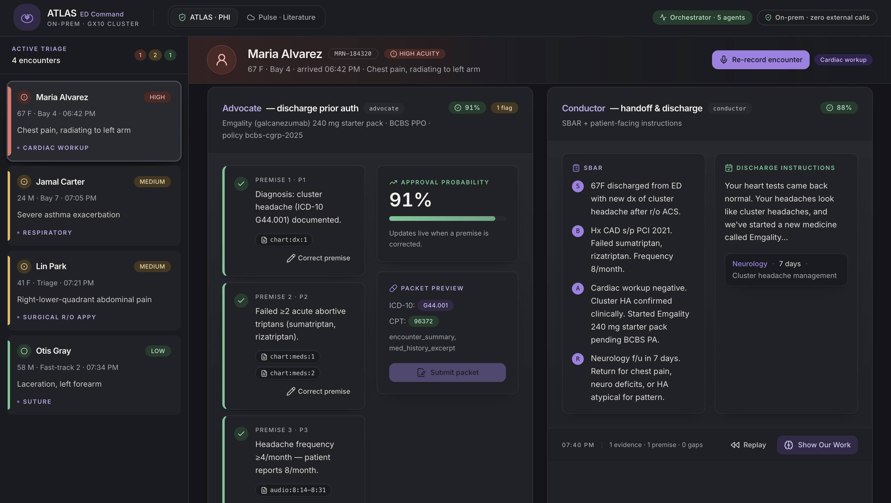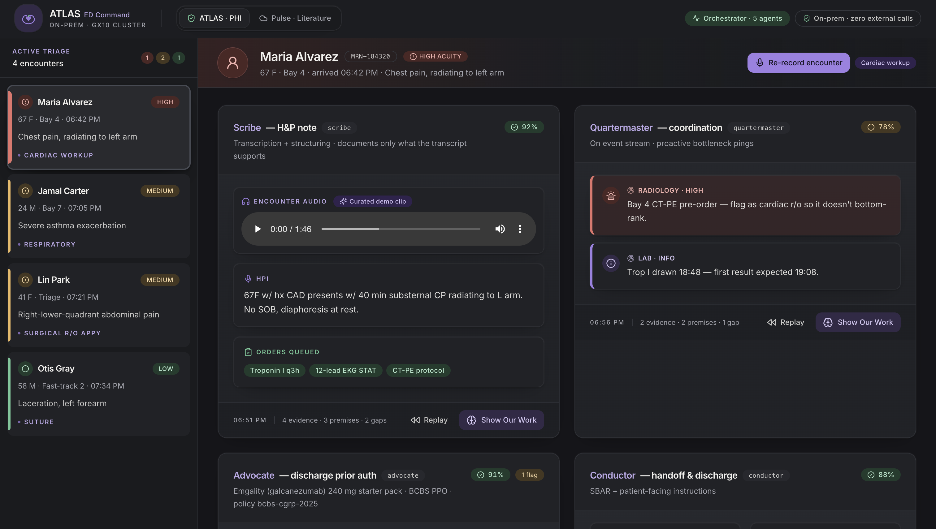 ATLAS is an on-prem, multi-agent system for emergency departments. It runs locally and coordinates five agents: