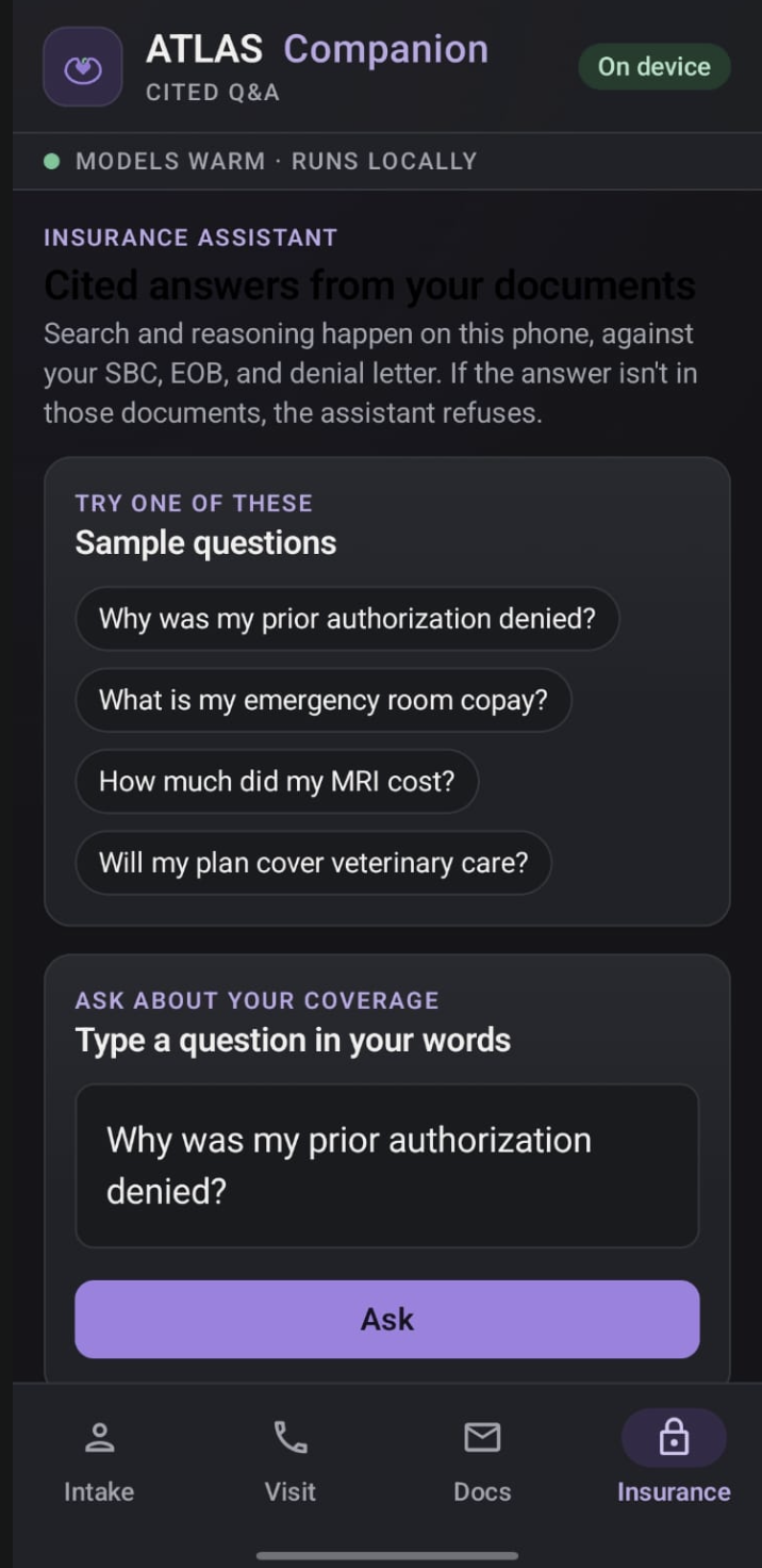 - Patient Companion app: an on-device app that summarizes visits and answers insurance questions using only the patient’s own documents