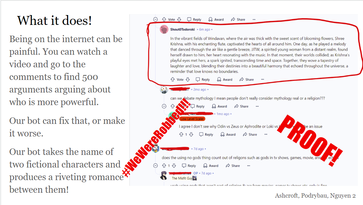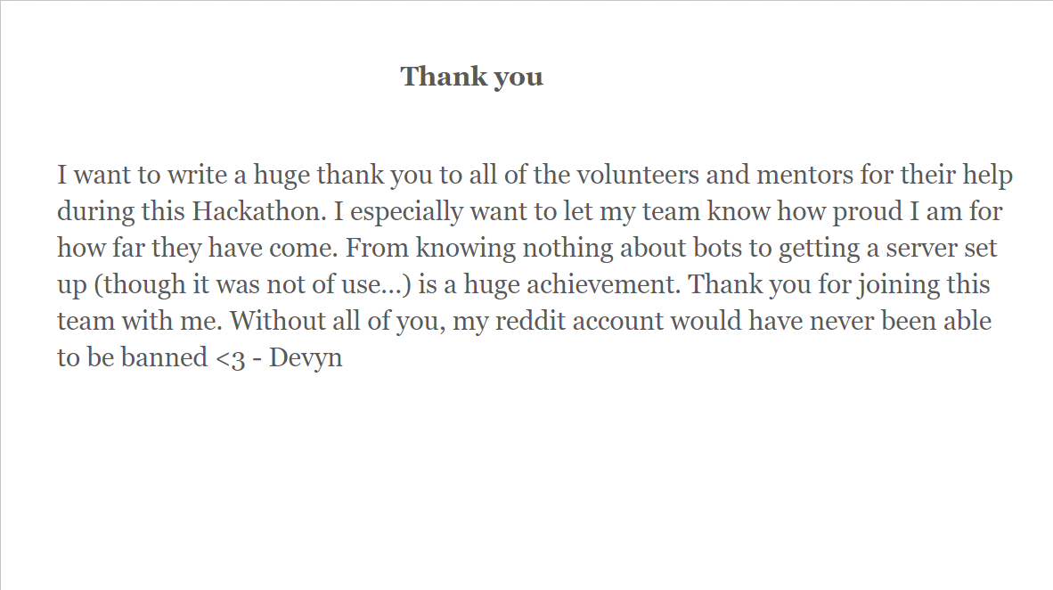 We got the bot to work for a bit! None of us have ever created a bot, nonetheless on reddit, so that was a huge accomplishment. I am proud of my team for their work ethic through all the stress and challenges.